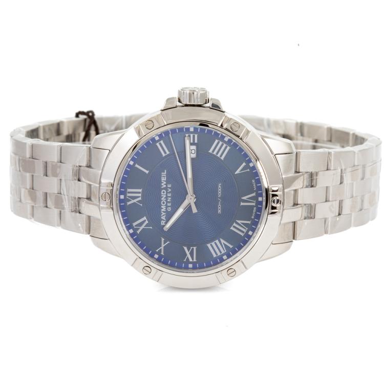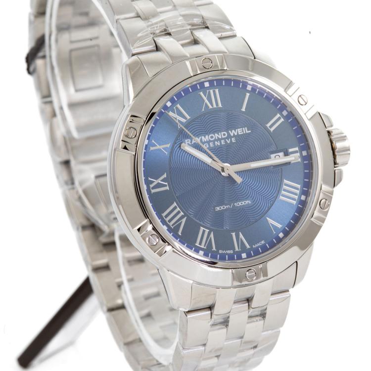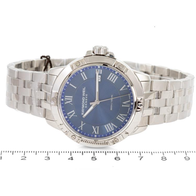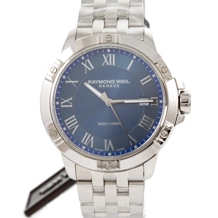 Raymond Weil Tango Classic stainless steel quartz mens watch. Blue dial, date, case diameter: 41mm, wrist size: 20.5cm, Swiss made. Ref# 8160-ST-00508. With Raymond Weil stainless steel bracelet and clasp. With Raymond Weil Guarantee card and Raymond Weil box. 12 month FSA warranty (As new, Note: case and bracelet in original wrapping)