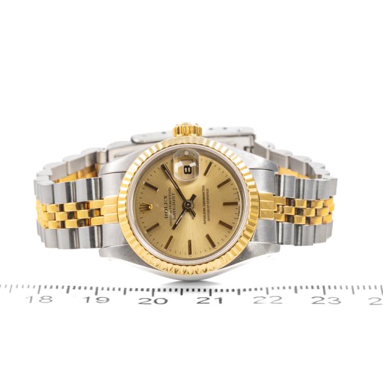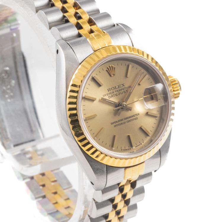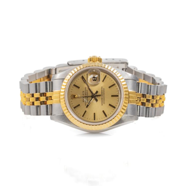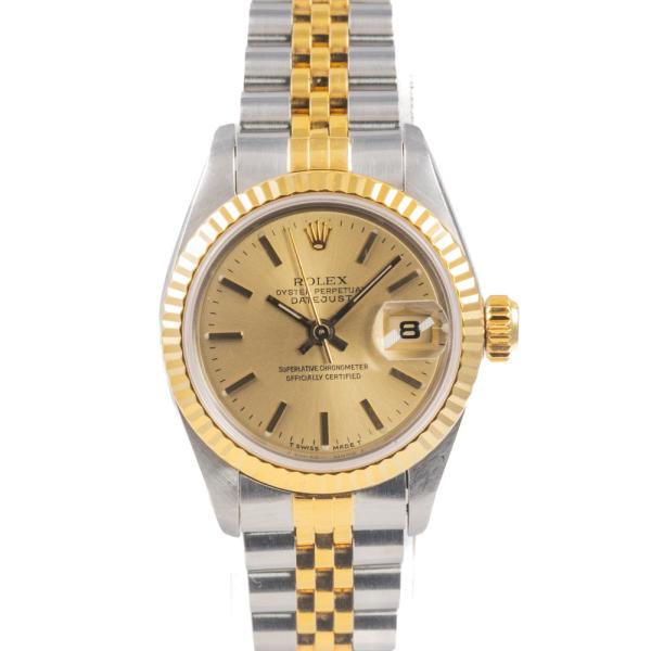 Rolex Oyster Perpetual Datejust 18ct yellow gold and stainless steel automatic ladies watch. Gold dial, date, case diameter: 26mm, wrist size: 15.5cm, Swiss made. Ref# 69173. Circa: 1990. With Rolex two-tone Jubilee bracelet and clasp. With Certificate of Authenticity and Rolex box. 3 month FSA warranty (Pre-owned)