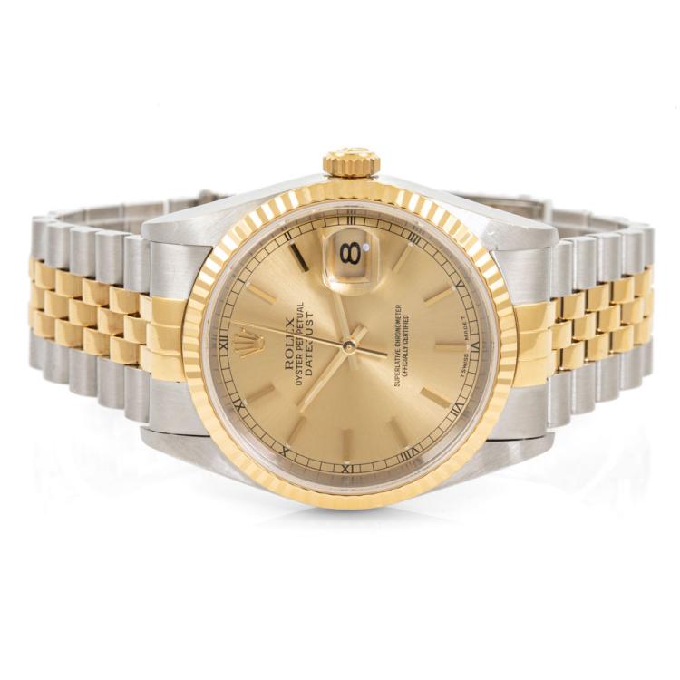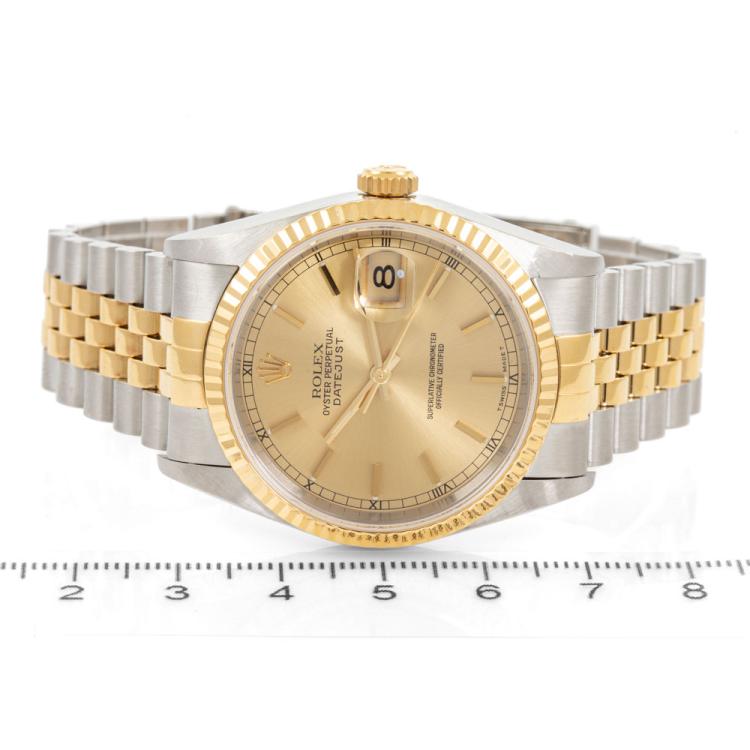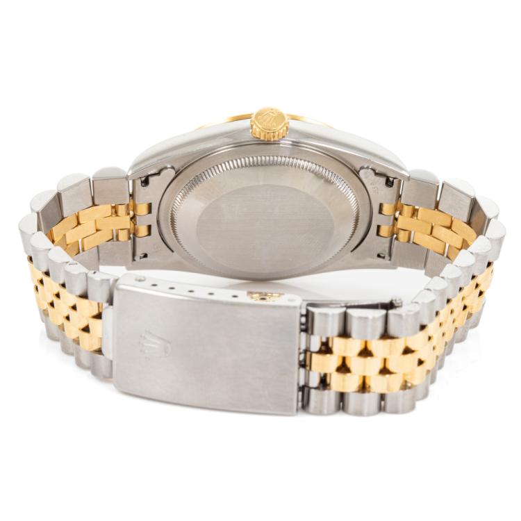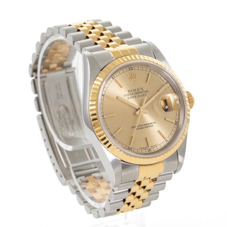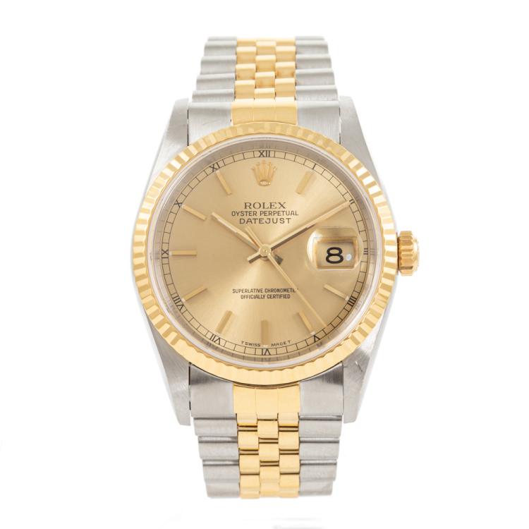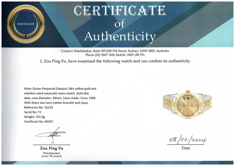 Rolex Oyster Perpetual Datejust 18ct yellow gold and stainless steel automatic mens watch. Gold dial, date, case diameter: 36mm, wrist size: 17.5cm, Swiss made. Ref# 16233. Circa: 1996. With Rolex two tone Jubilee bracelet and clasp. With Certificate of Authenticity, Rolex International Service Guarantee card dated 13/12/2018 and Rolex box. 3 month FSA warranty (Pre-owned)