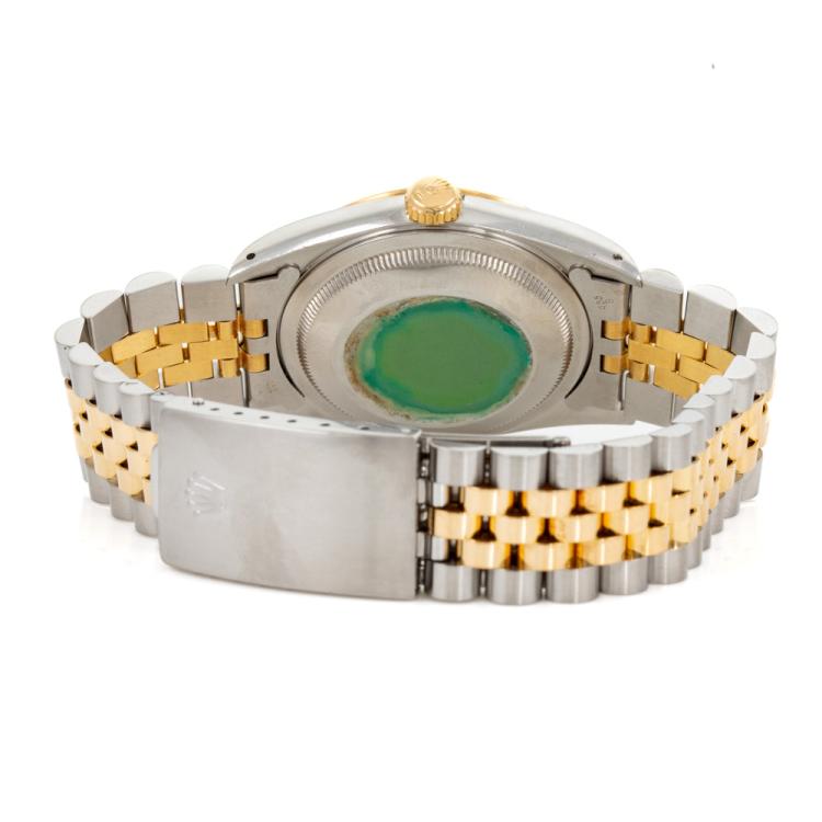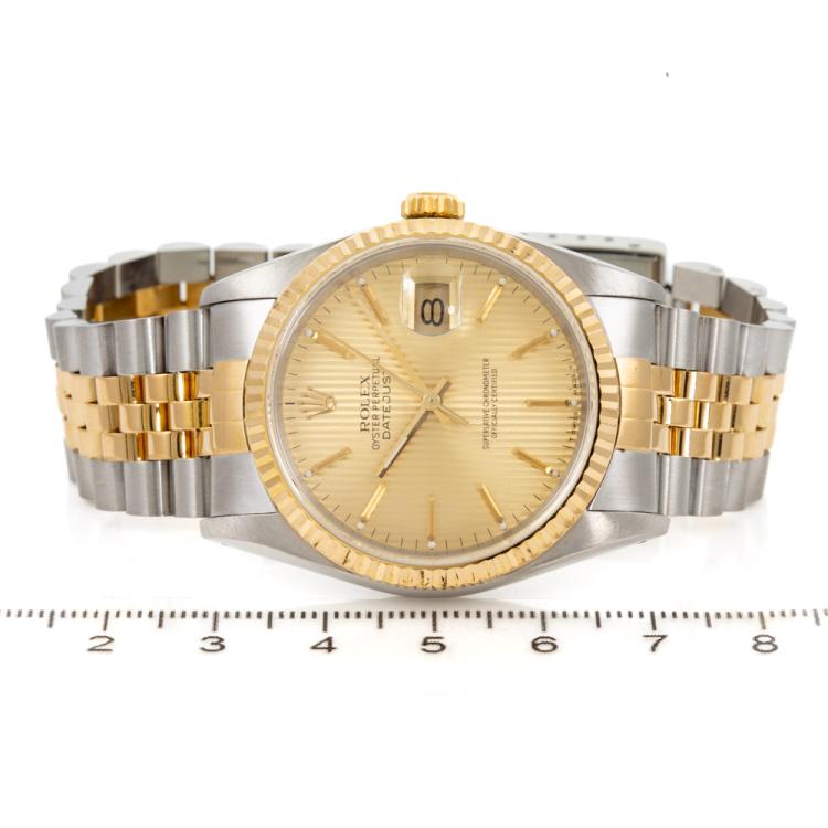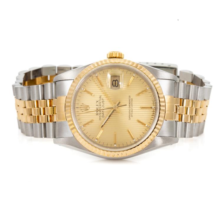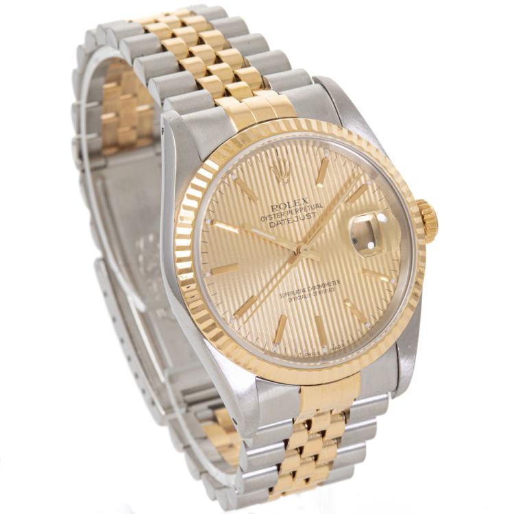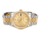 Rolex Oyster Perpetual Datejust 18ct yellow gold and stainless steel automatic mens watch. Gold dial, date, case diameter: 36mm, wrist size: 18.5cm, Swiss made. Ref# 16233. Circa: 1992. With Rolex two tone Jubilee bracelet and clasp. With Certificate of Authenticity, Watchmaker full service invoice dated 25/03/24 and Rolex box. 12 months watchmaker warranty from the date of service. (Pre-owned)