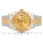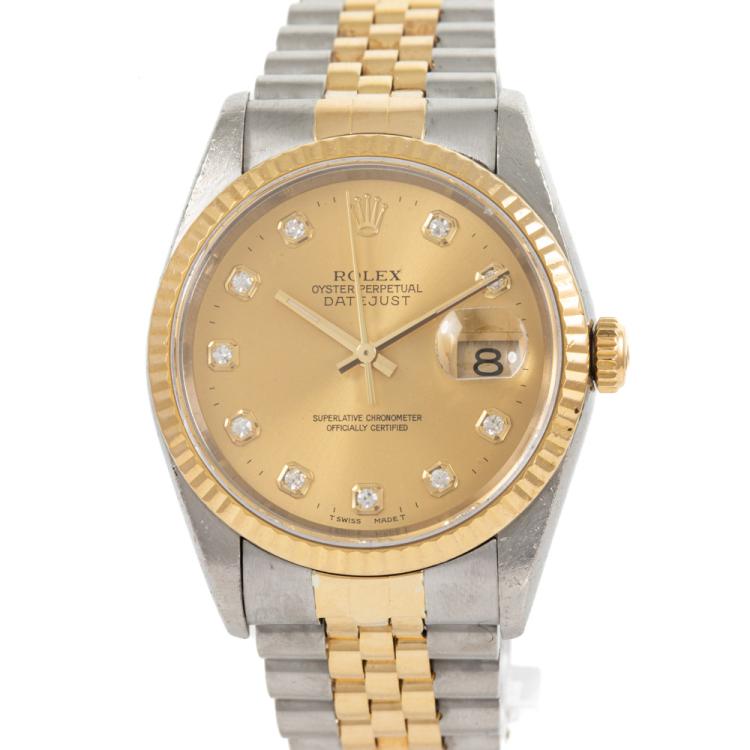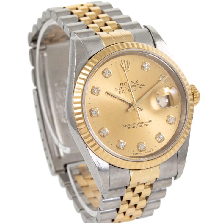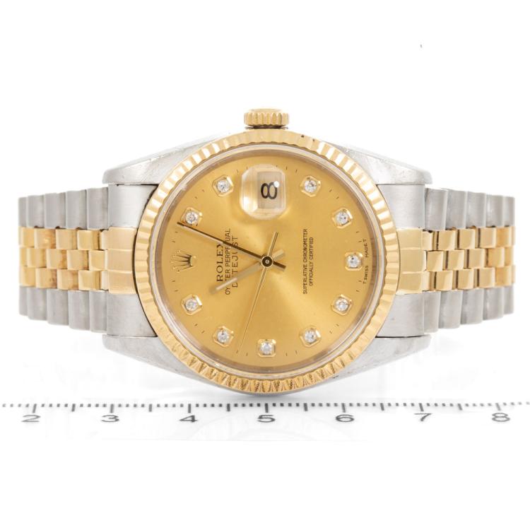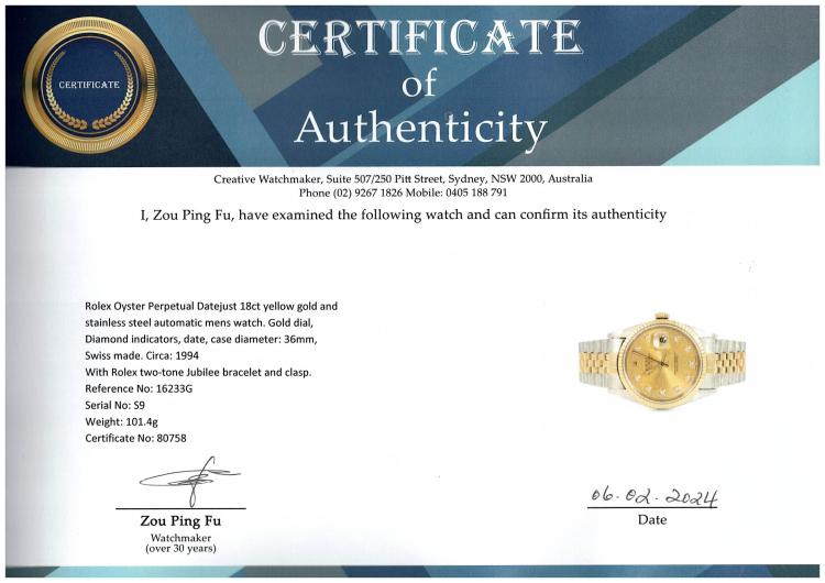 Rolex Oyster Perpetual Datejust 18ct yellow gold and stainless steel automatic mens watch. Gold dial, Diamond indicators, date, case diameter: 36mm, wrist size: 17.5cm, Swiss made. Ref# 16233G. Circa: 1994. With Rolex two-tone Jubilee bracelet and clasp. With Certificate of Authenticity. 3 month FSA warranty (Pre-owned)