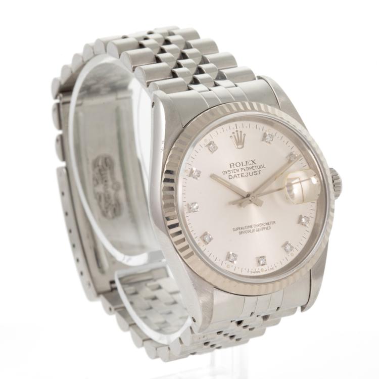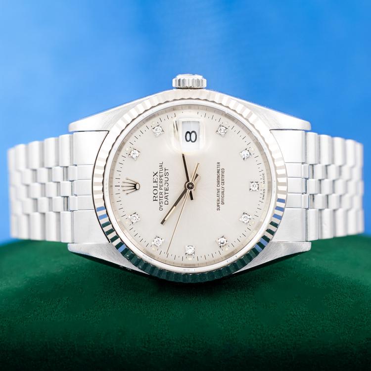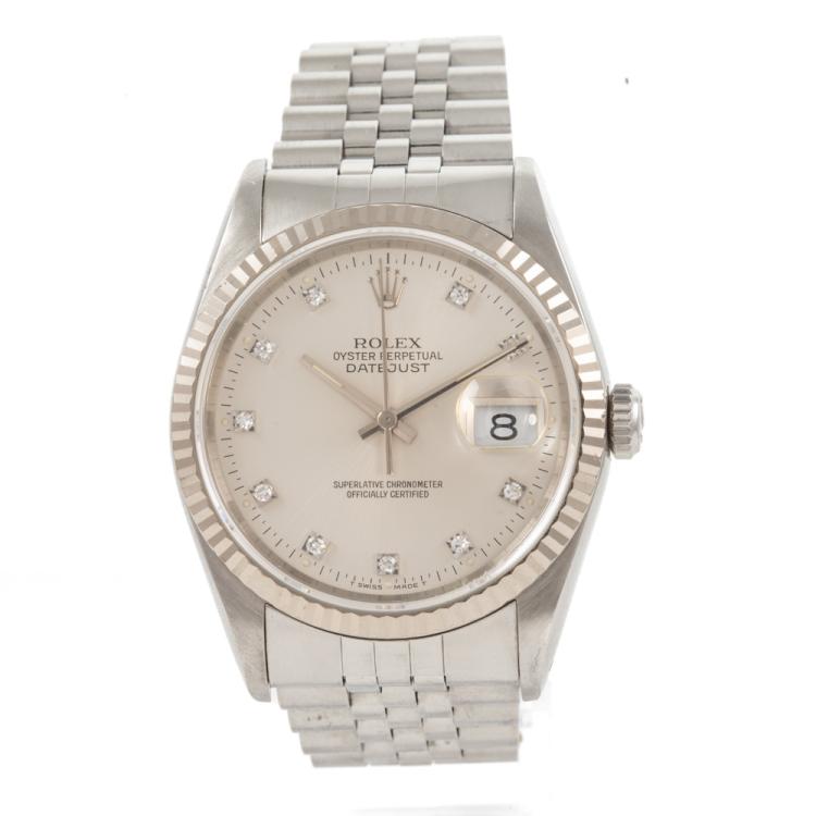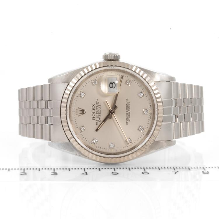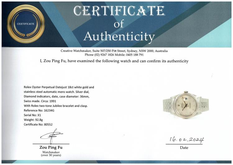 Rolex Oyster Perpetual Datejust 18ct white gold and stainless steel automatic mens watch. Silver dial, Diamond indicators, date, case diameter: 36mm, wrist size: 17.5cm, Swiss made. Ref# 16234G. Circa: 1991. With Rolex stainless steel Jubilee bracelet and clasp. With Certificate Authenticity and Rolex box. 3 month FSA warranty (Pre-owned)