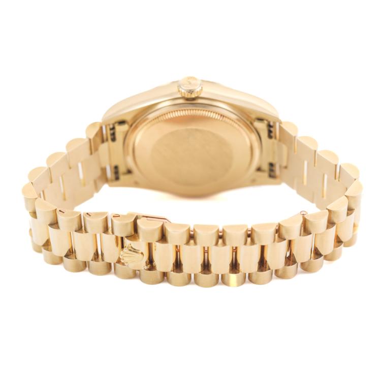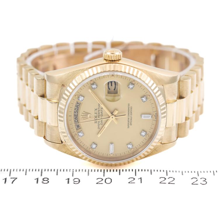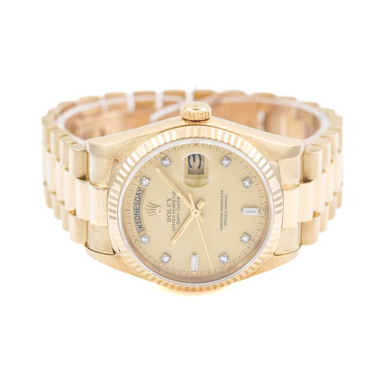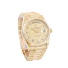 Rolex Oyster Perpetual Day Date 18ct yellow gold automatic mens watch. Gold dial, Diamond indicators, day & date, case diameter: 36mm, wrist size: 17cm, Swiss made. Ref# 18038A. Circa: 1986. With Rolex 18ct yellow gold Presidential bracelet and clasp. With Certificate of Authenticity and Rolex box. 3 month FSA warranty (Pre-owned)