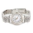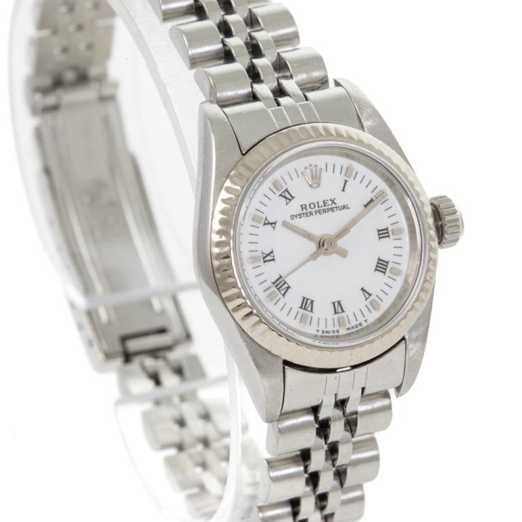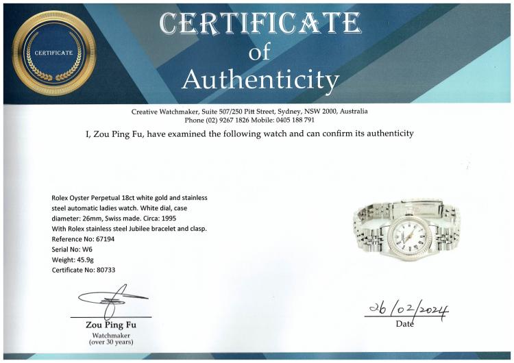 Rolex Oyster Perpetual 18ct white gold and stainless steel automatic ladies watch. White dial, case diameter: 26mm, wrist size: 18.5cm, Swiss made. Ref# 67194. Circa: 1995. With Rolex stainless steel bracelet and clasp. With Certificate of Authenticity, Rolex Guarantee Certificate dated 27/09/1997 and Rolex box. 3 month FSA warranty (Pre-owned)