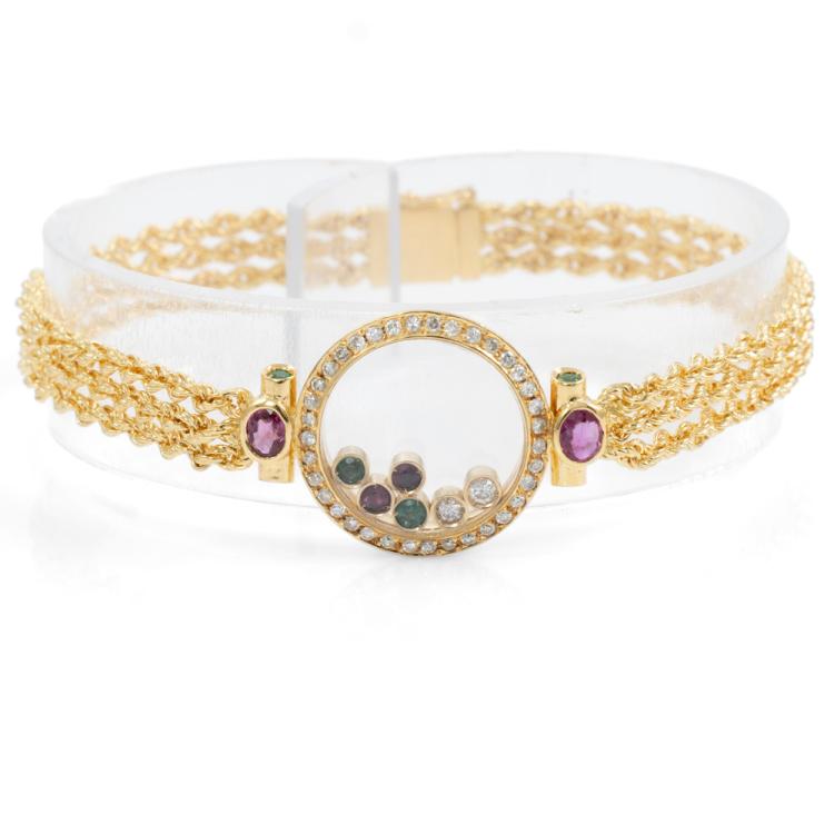 Ruby, Emerald, Diamond bracelet with round & oval shape Natural Rubies totalling approximately 0.35cts, round Natural Emerald totalling approximately 0.12cts, and round Diamonds totalling approximately 0.25cts. 18ct yellow gold. Length: 17cm. Weight: 13.6g. (Pre-owned)