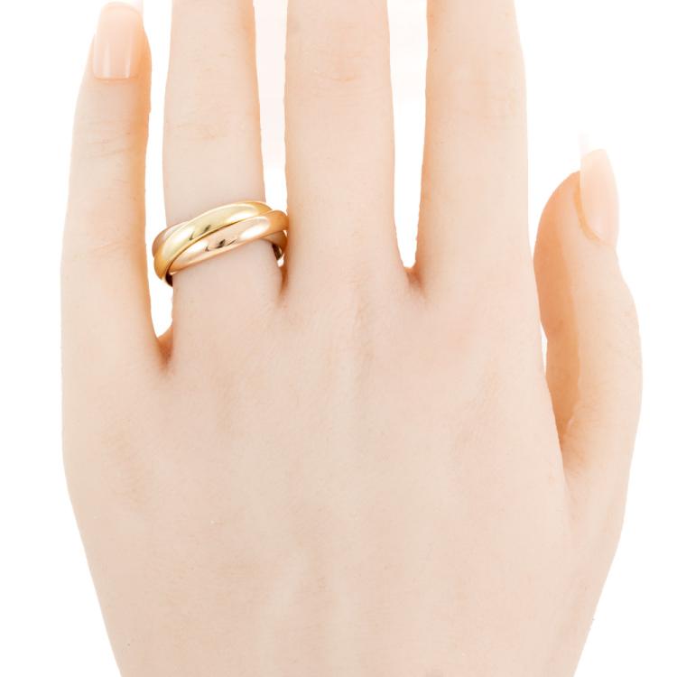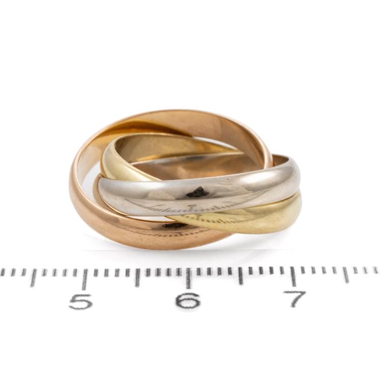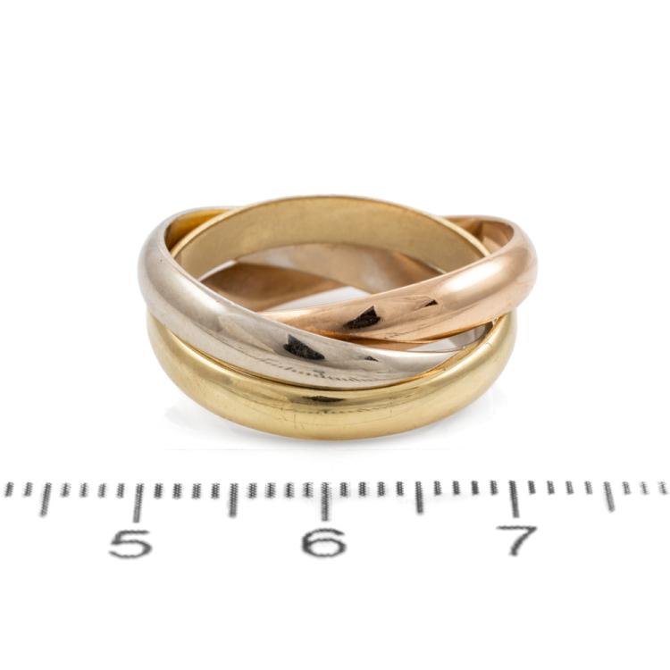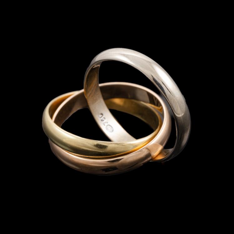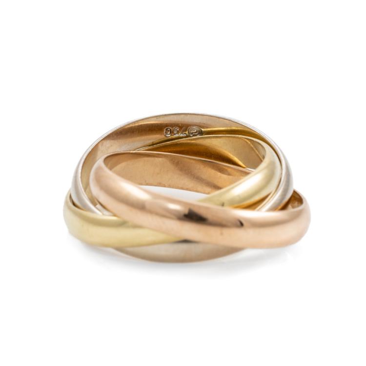 Russian three-tone gold ring. 18ct white, yellow and rose gold. Ring size N½ - ring resize is not recommended. Each band width: 3.5mm. Weight: 9.0g. (Pre-owned)