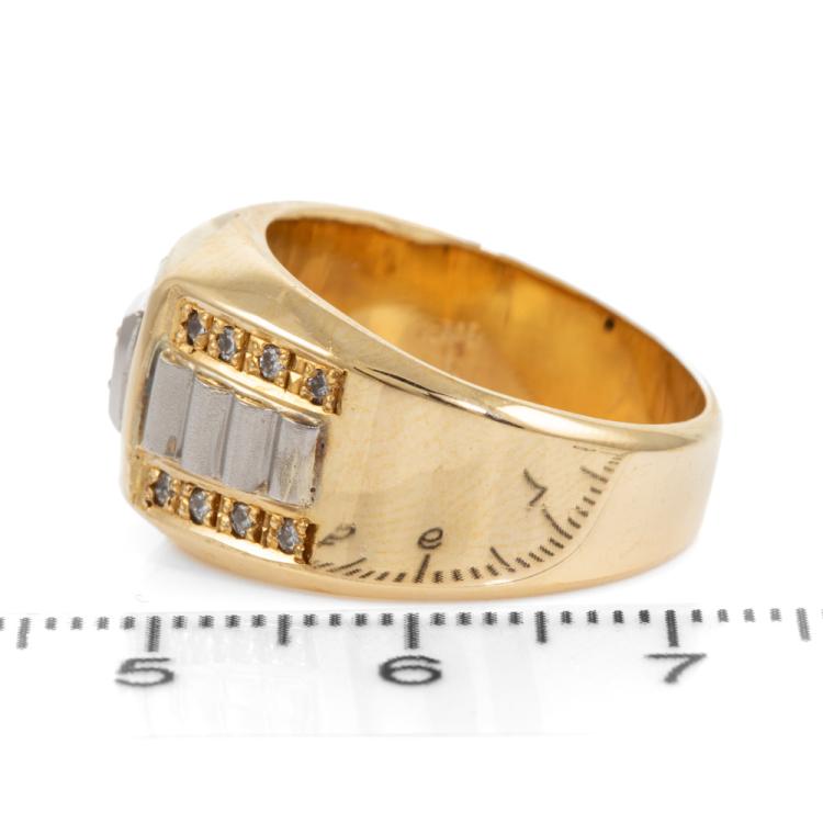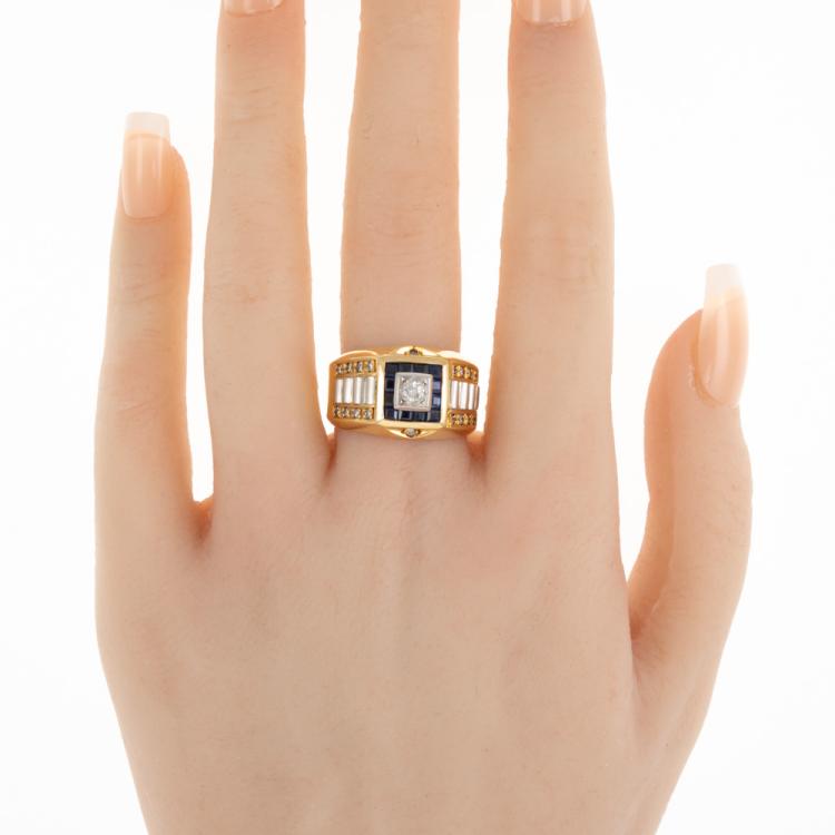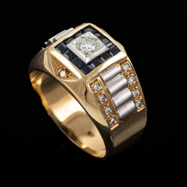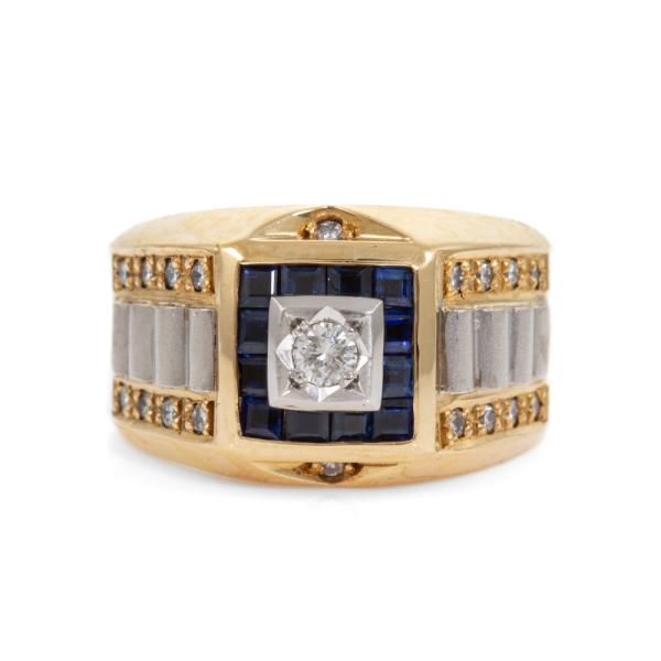 Mens ring with carre cut natural blue Sapphires totalling approximately 0.24ct and round natural Diamonds totalling approximately 0.18ct. 18ct yellow gold and Platinum 900. Ring size P1/2. Band width: 5.4 - 12.2mm. Weight: 13.4g. (Pre-owned)