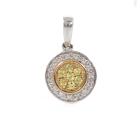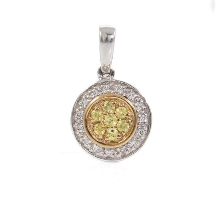 Two piece Yellow Sapphire set: 1) Sapphire and Diamond ring with round yellow Natural Sapphires totalling approx. 0.10cts and round Natural Diamonds totalling approx. 0.15cts. Ring size L. Band width: 1.4mm - 1.5mm. 2) Sapphire and Diamond pendant with round yellow Natural Sapphires totalling 0.07cts and round Natural Diamonds totalling 0.10cts. 9ct white and yellow gold. No chain provided. All 9ct yellow & white gold. Total weight: 2.6g (As new)