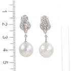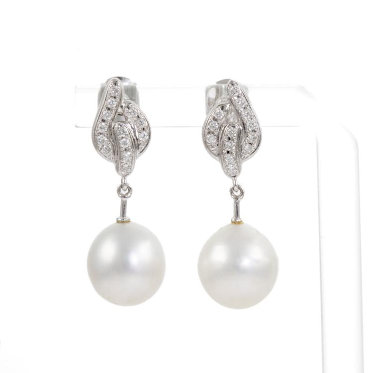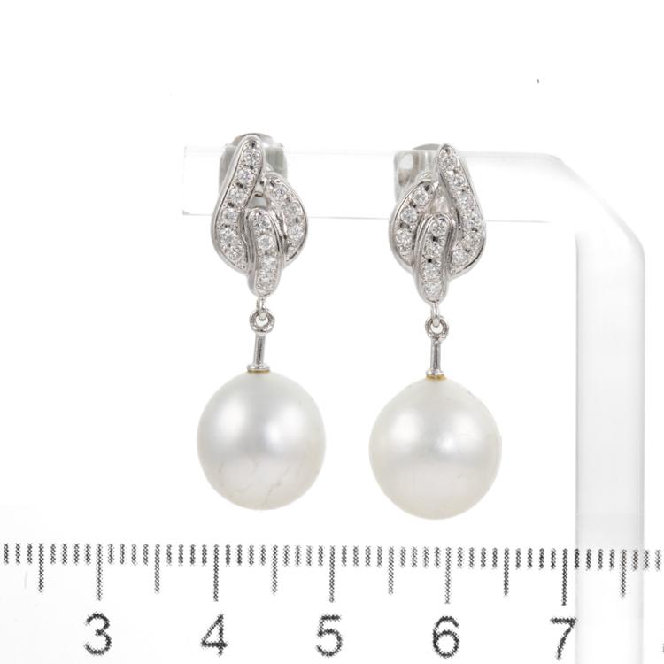 Pearl and Diamond drop earrings with South Sea Pearl of 11.1mm & 11.4mm and round Natural Diamonds totalling 0.31cts (Estimated grading: H SI). 18ct white gold. Weight: 7.9g. (Pre-owned)