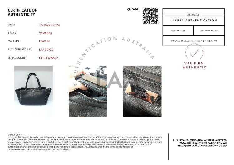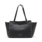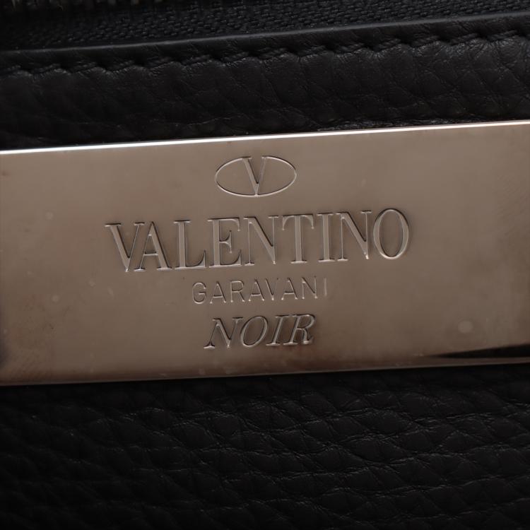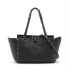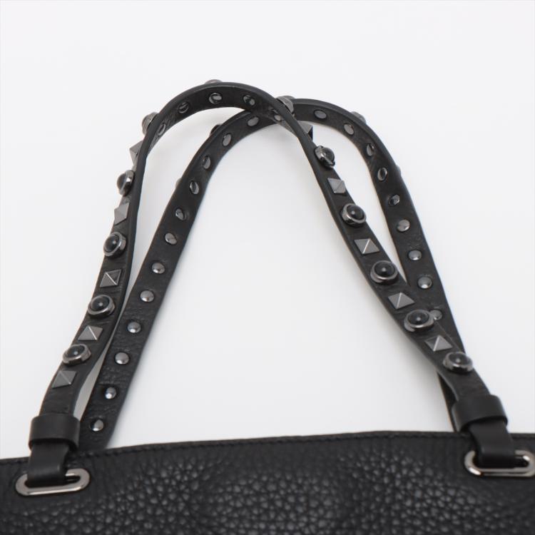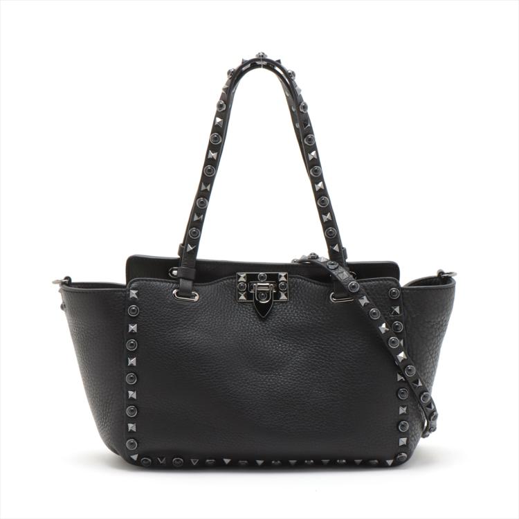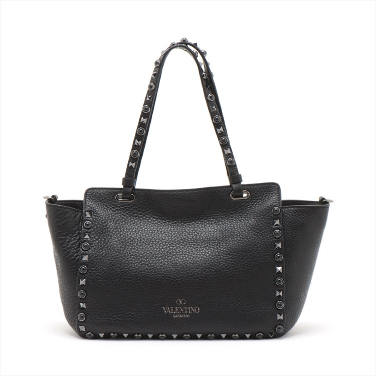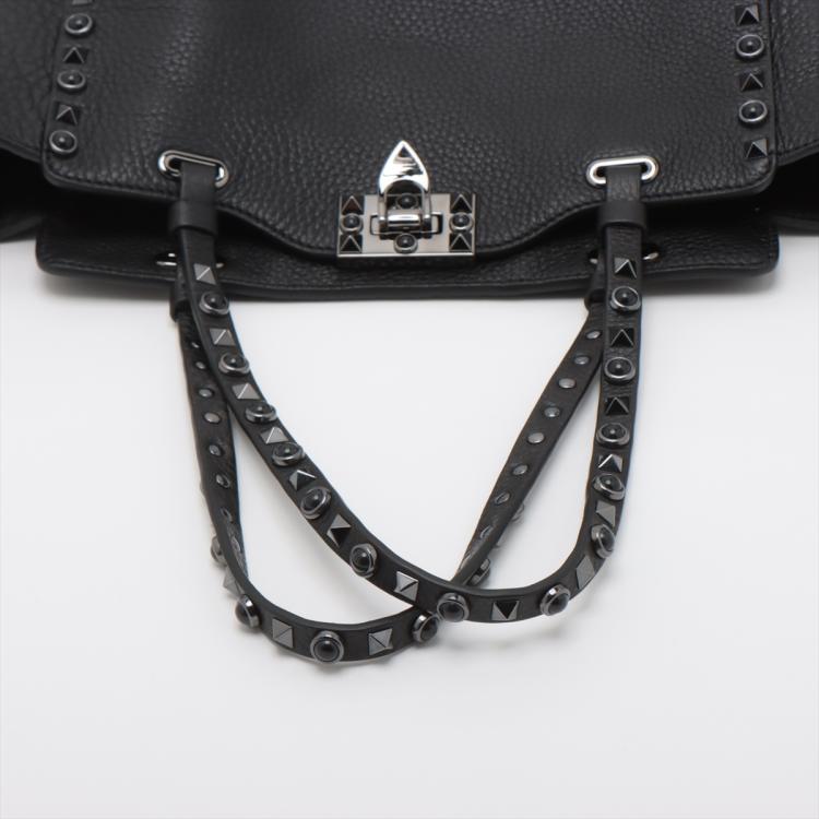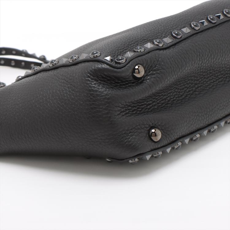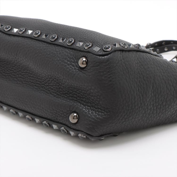 Valentino Garavani small Rockstud bag in black grainy calfskin. Featuring black-toned studs and hardware, pyramid studs lining the borders of the bag body, handls and shoulder strap. A studded switch lock closure on top. This opens to a spacious black suede leather interior with a hanging zipper pocket. Approximate dimensions: 26cm(L) x 18cm(H) x11cm(D), 18cm handle height and 47cm strap height. With Australia Luxury Authentication certificate. (Pre-owned)