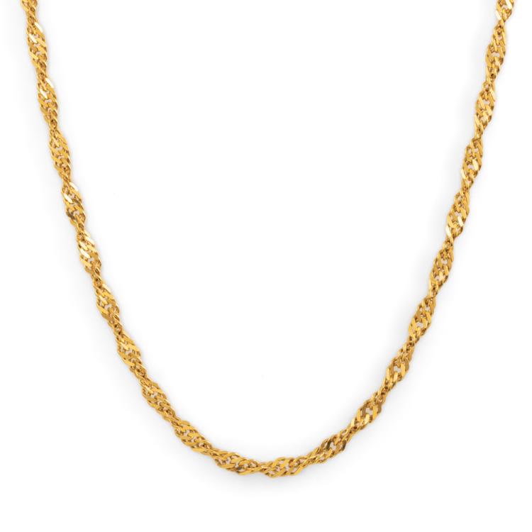 Singapore gold chain. 22ct yellow gold (XRF tested, not stamped) with 18ct yellow gold clasp (Stamped). Length: 45cm. Weight: 9.5g. (Pre-owned)
