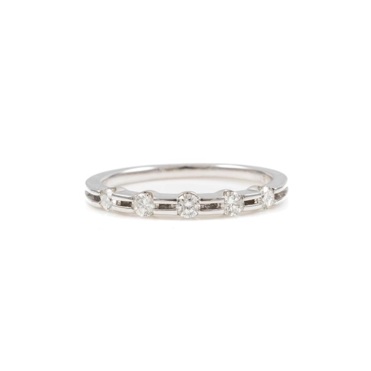 Diamond eternity ring with 5 round Natural Diamonds totalling 0.25cts. 18ct white gold. Ring size M1/2. Band width: 1.4mm-1.9mm. Weight: 2.4g. (Pre-owned)