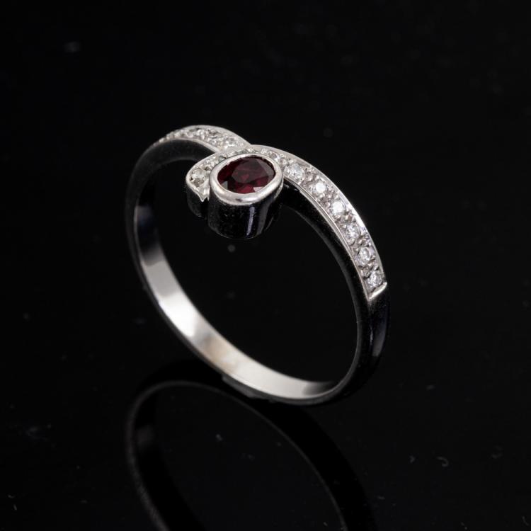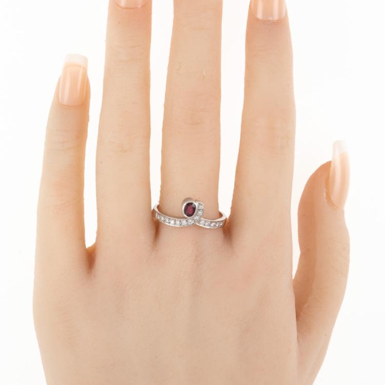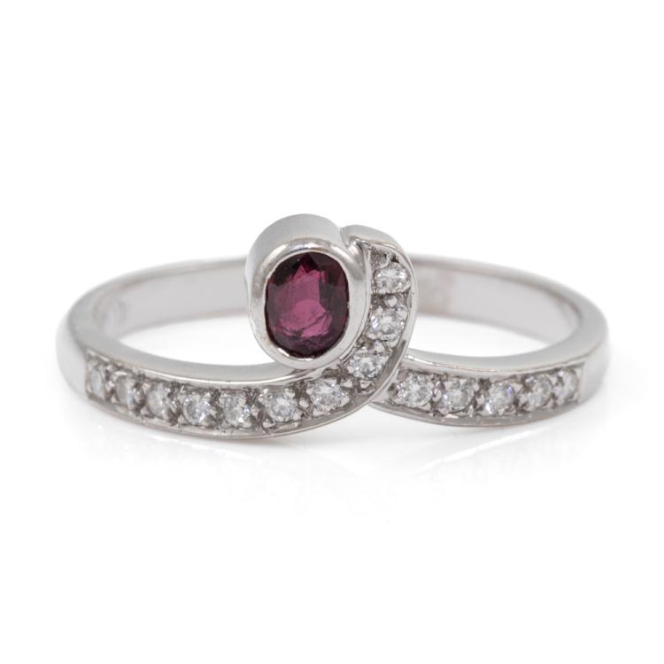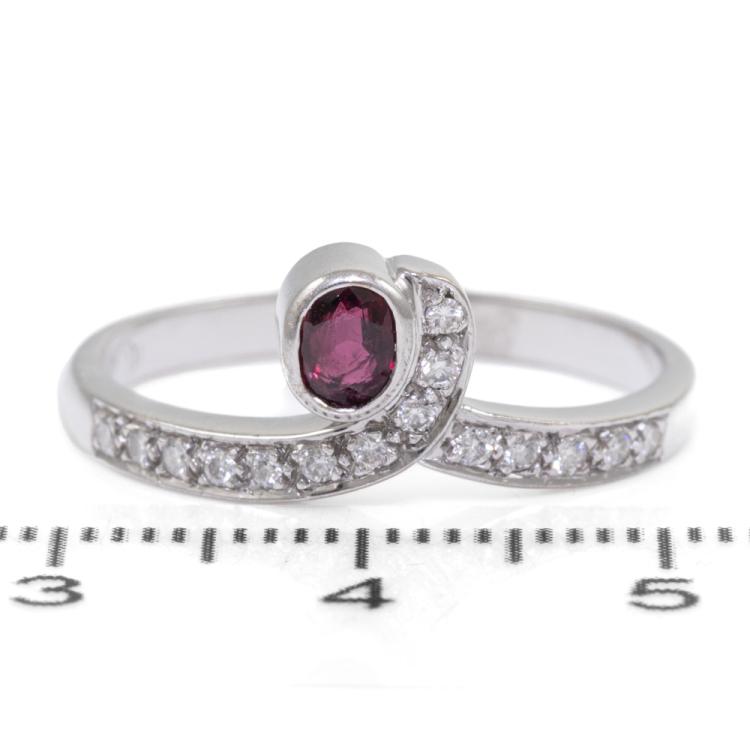 Ruby and Diamond ring with an oval Natural Ruby of approximately 0.25ct and round Natural Diamonds totalling approximately 0.15ct. 18ct white gold. Ring size R1/2. Band width: 2.3mm-2.5mm. Weight: 4g. (Pre-owned)