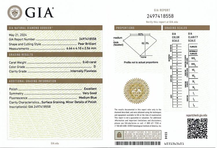 A loose pear shape natural Diamond of 0.40ct (with GIA Diamond Dossier report graded as D Internally Flawless #2497418558). (New)
