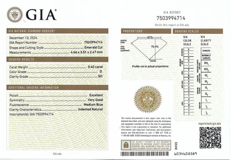 A loose emerald cut natural Diamond of 0.40ct (with GIA Summary Report graded as D SI1 #7503994714). (New)