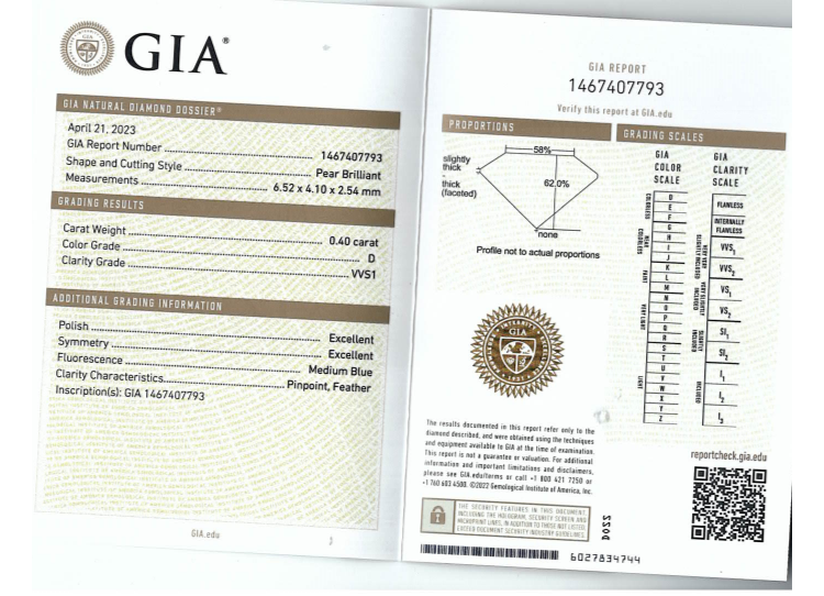 A loose pear shape Natural Diamond of 0.40ct (with GIA summary report graded as D VVS1 #1467407793). (New)
