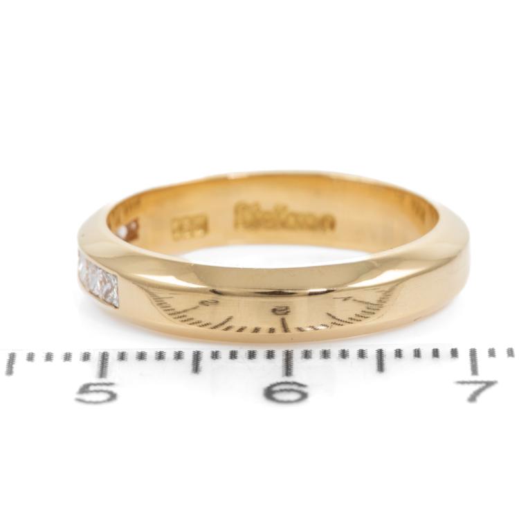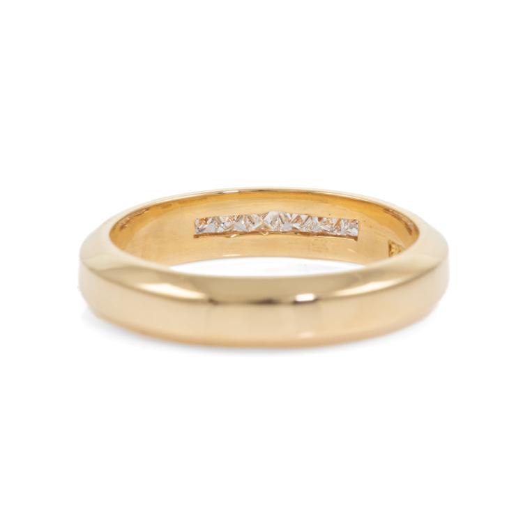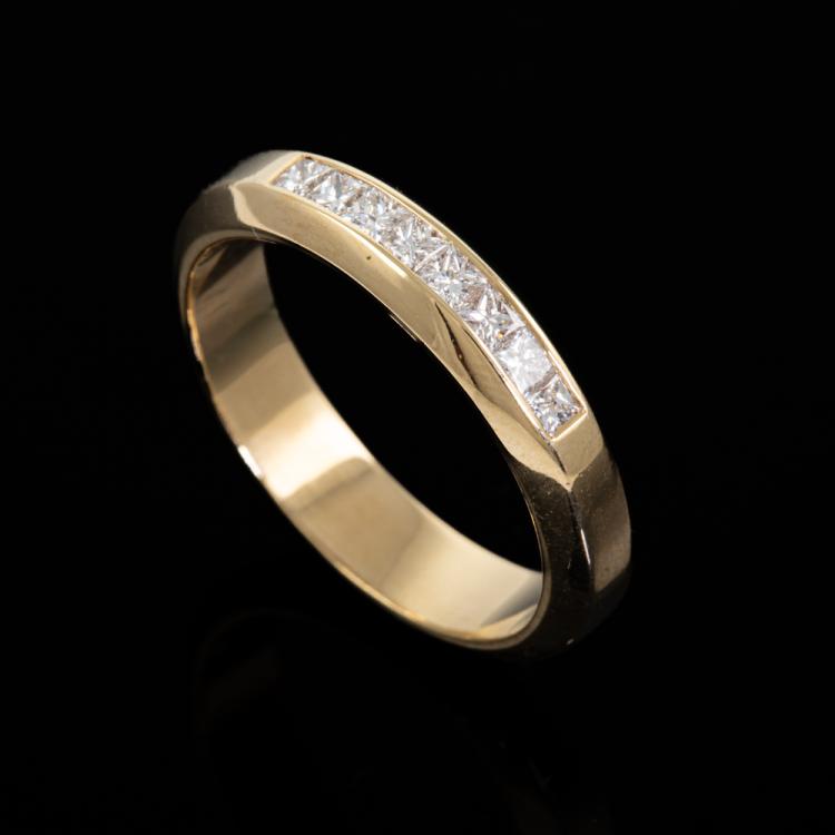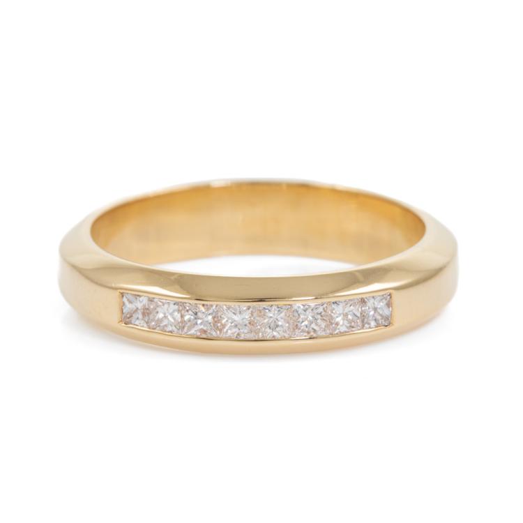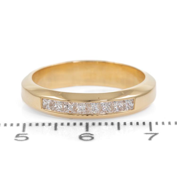 Diamond eternity ring with 8 princess cut Natural Diamonds totalling approximately 0.50ct (Estimated grading: H-I VS-SI). 18ct yellow gold. Ring size: Q - ring resizing not recommended. Band width 4.40mm. Weight: 6.3g. (Pre-Owned)