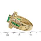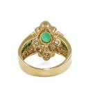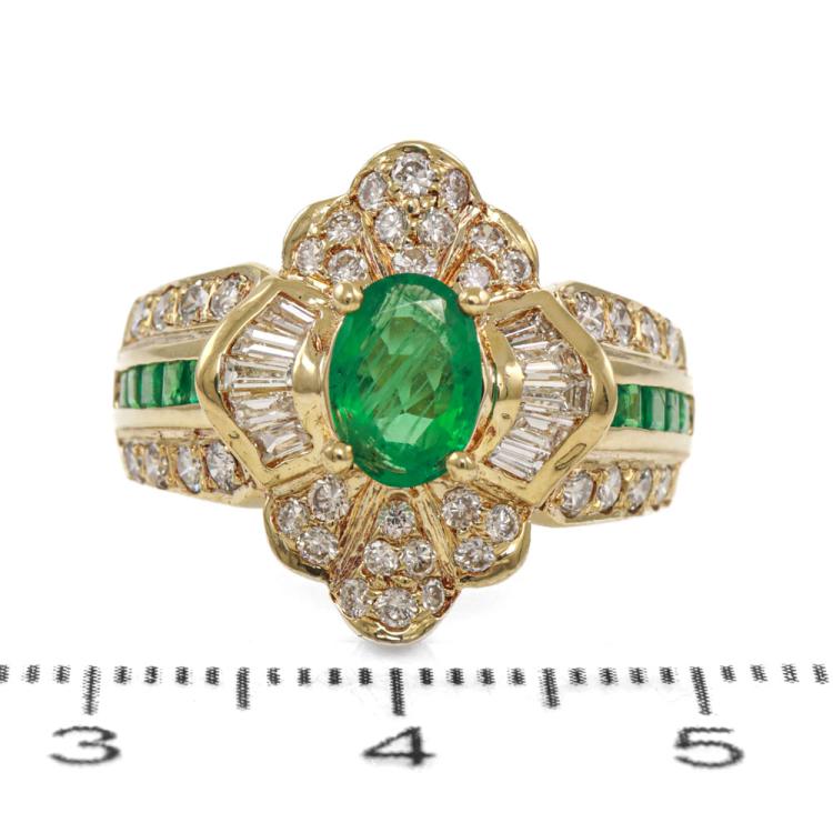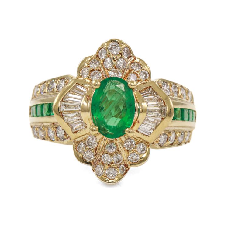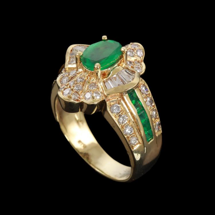 Emerald and Diamond ring with oval & square cut Natural Emeralds totalling 0.72ct and round & baguette cut Natural Diamonds totalling 0.85 (Estimated grading: I-J SI). 18ct yellow gold. Ring size: L. Band width: 3.7mm - 6.2mm. Weight: 8.2g. (Pre-owned)