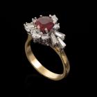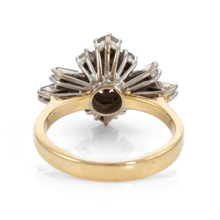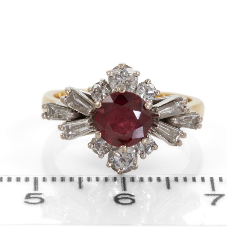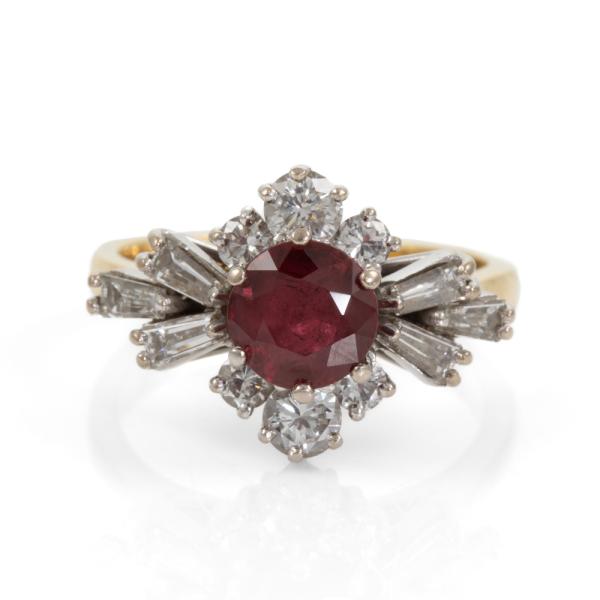 Ruby and Diamond ring with round Ruby of approximately 0.90ct and round & baguette cut Natural Diamonds totalling approximately 0.55ct (Estimated grading: H-I SI). 18ct yellow & white gold. Ring size: L. Band width: 2.7mm - 1.8mm. Weight: 5.7g. (Pre-owned)