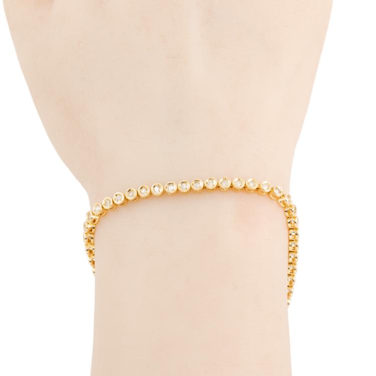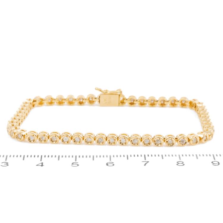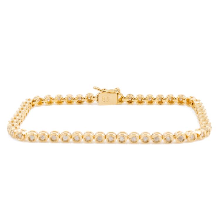 Diamond tennis bracelet with 42 round natural Diamonds totalling 1.05cts (Estimated grading: I-J SI-P1). 18ct yellow gold. Length: 18cm. Weight: 10.9g. (Pre-owned)