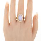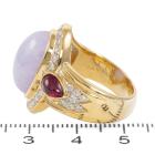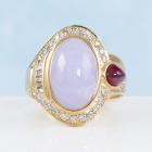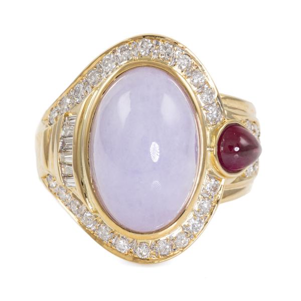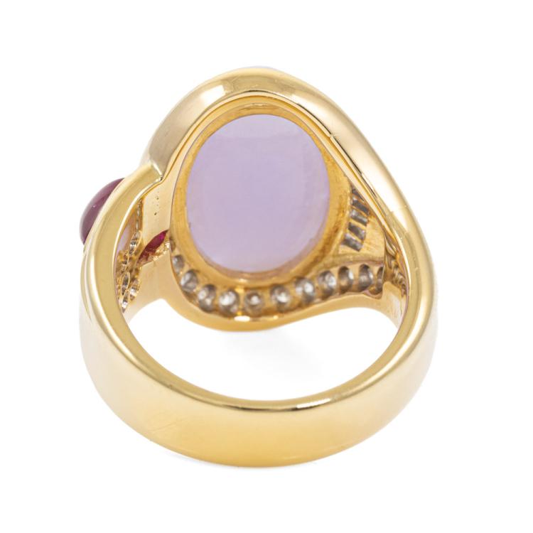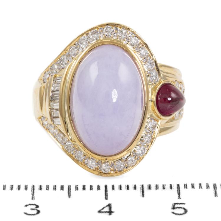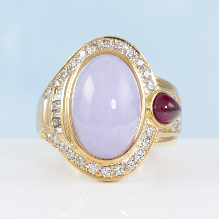 Jade, Ruby and Diamond ring with oval cabochon cut Natural Lavender Jadeite Jade - Type A of 11.04ct, pear shape cabochon cut Natural Ruby of 0.80ct and round & baguette cut Natural Diamonds totalling 0.79ct (Estimated grading: G-I SI). 18ct yellow gold. Ring size: N. Band width: 5.4mm-7.8mm. Weight: 16.0g. With Certificate #419080. (Pre-owned)