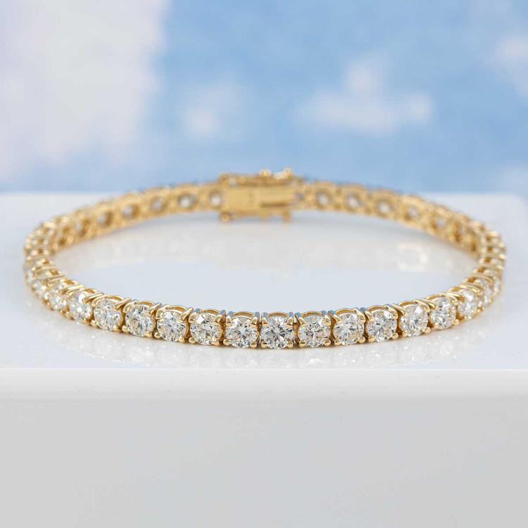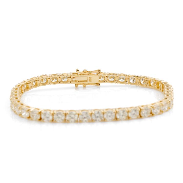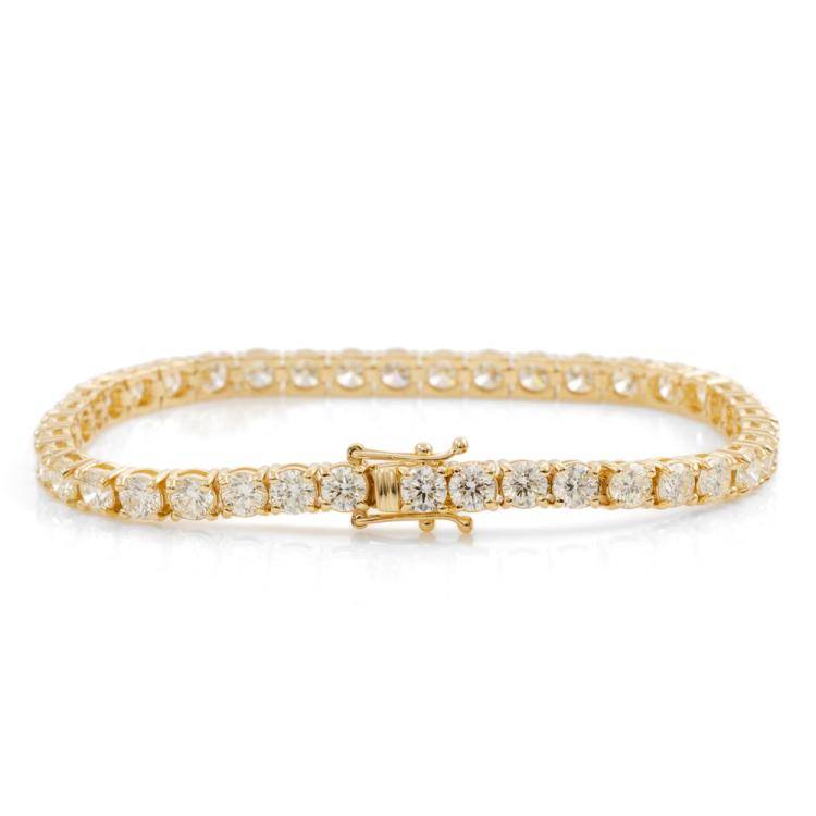 Diamond tennis bracelet with 40 round brilliant cut Natural Diamonds totalling 12.05cts (Estimated grading: J-K VS). 18ct yellow gold. Length: 18cm. Weight: 16.0g. With Valuation Certificate #418448. (New)