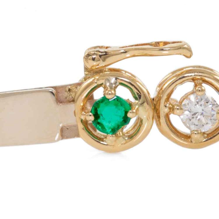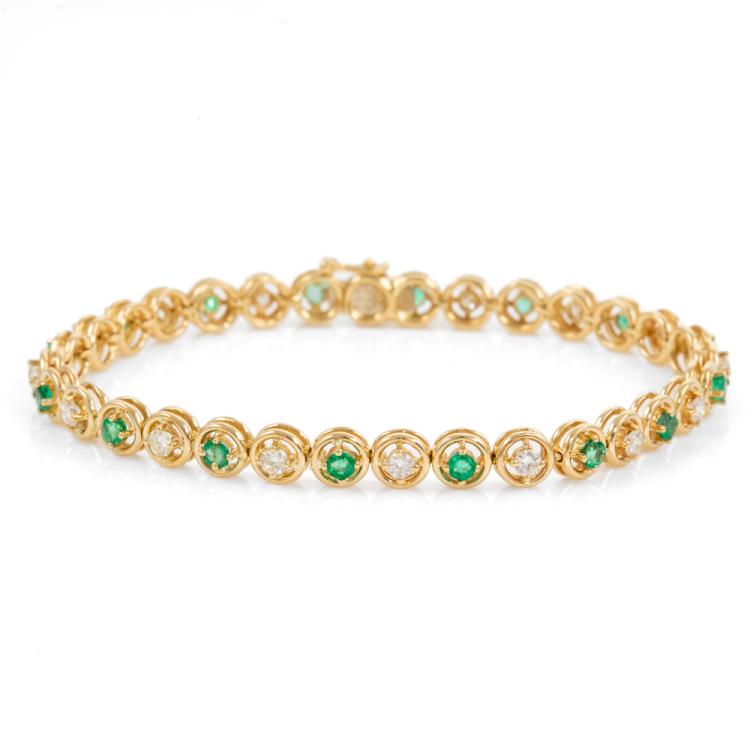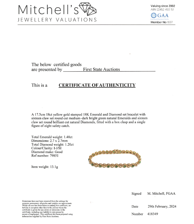 Emerald and Diamond bracelet with round Natural Emerald totalling 1.40cts (Note - 1 Emeralds next to clasp with chip) and round Natural Diamonds totalling 1.20cts (Estimated grading: I-J SI). 18ct yellow gold. Length: 17.5cm. Weight: 13.1g. With Certificate #418349. (Pre-owned)