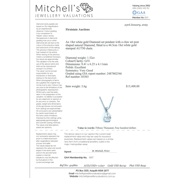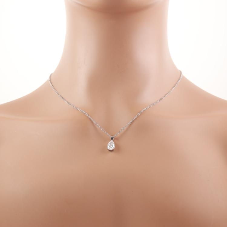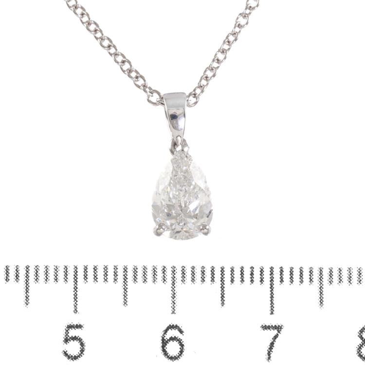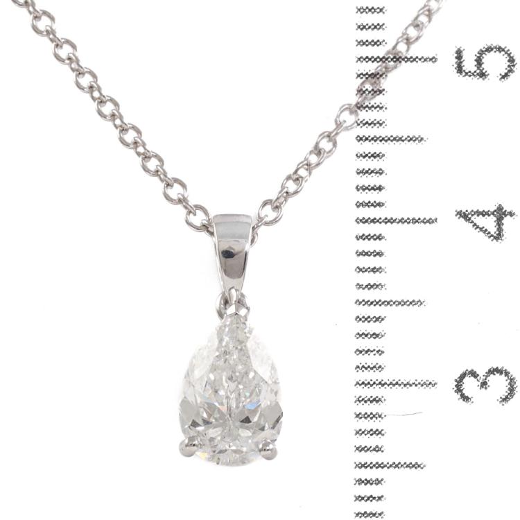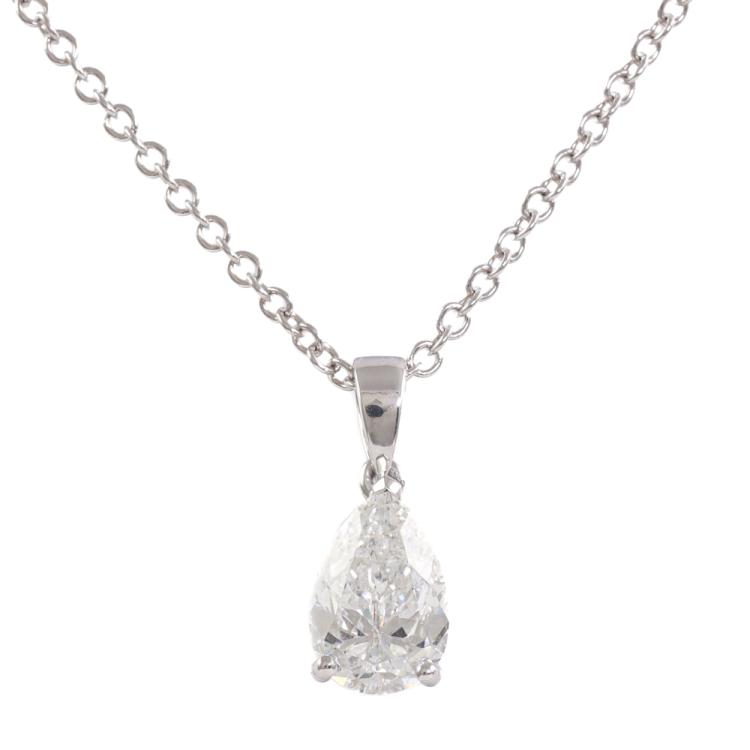 Diamond solitaire pendant with pear shape Natural Diamond of 1.52ct (with GIA Report graded as G P1 #2487802546). 18ct white gold with 44.5cm 18ct white gold chain. Weight: 3.6g. With Valuation Certificate #419862. (New)