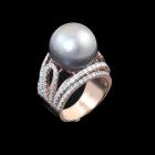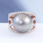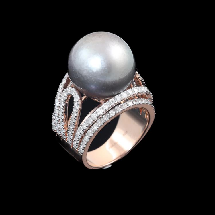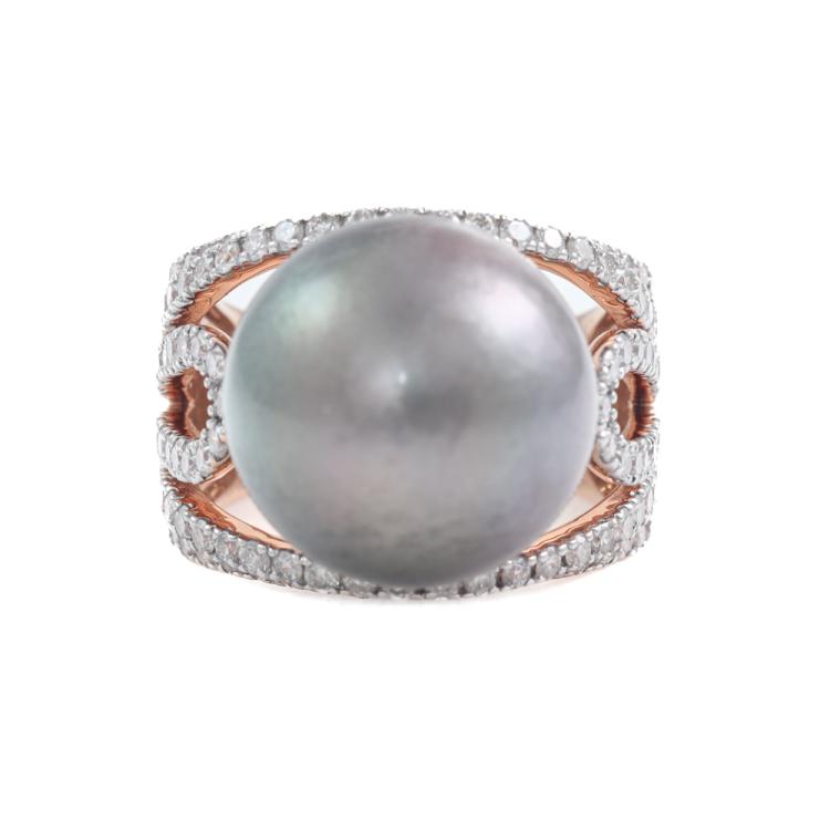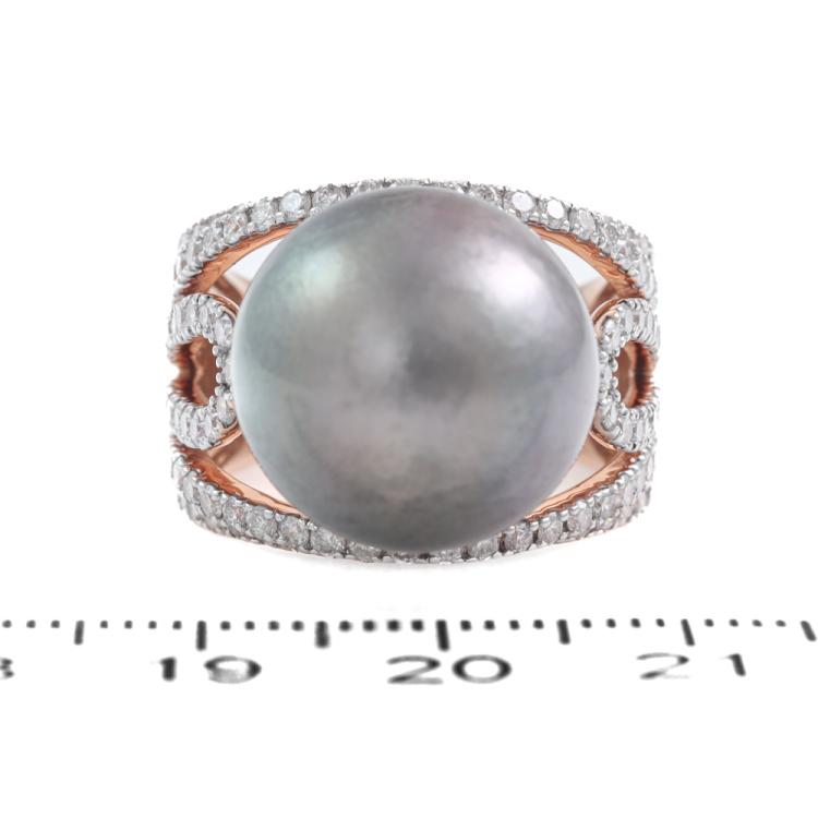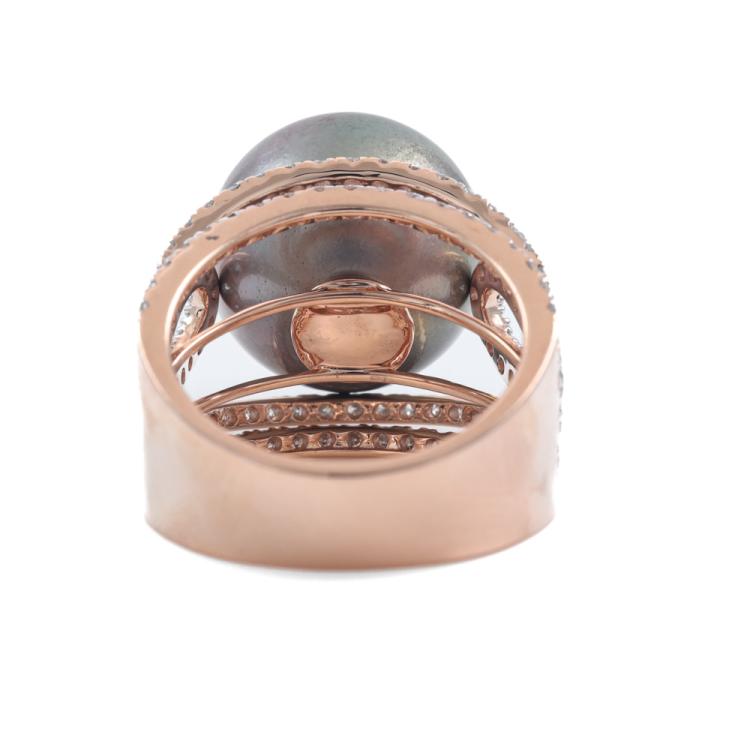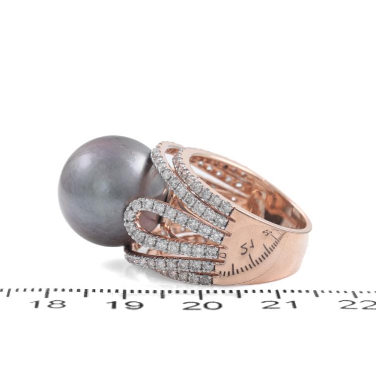 Pearl and Diamond ring with Tahitian Pearl of 15.4mm and round Natural Diamonds totalling 1.82ct (Estimated grading: I-K SI-P). 14ct rose gold. Ring size N. Band width: 12.1mm - 8.6mm. Weight: 14.3g. With Copy of Valuation Certificate # D1286. (Pre-owned)