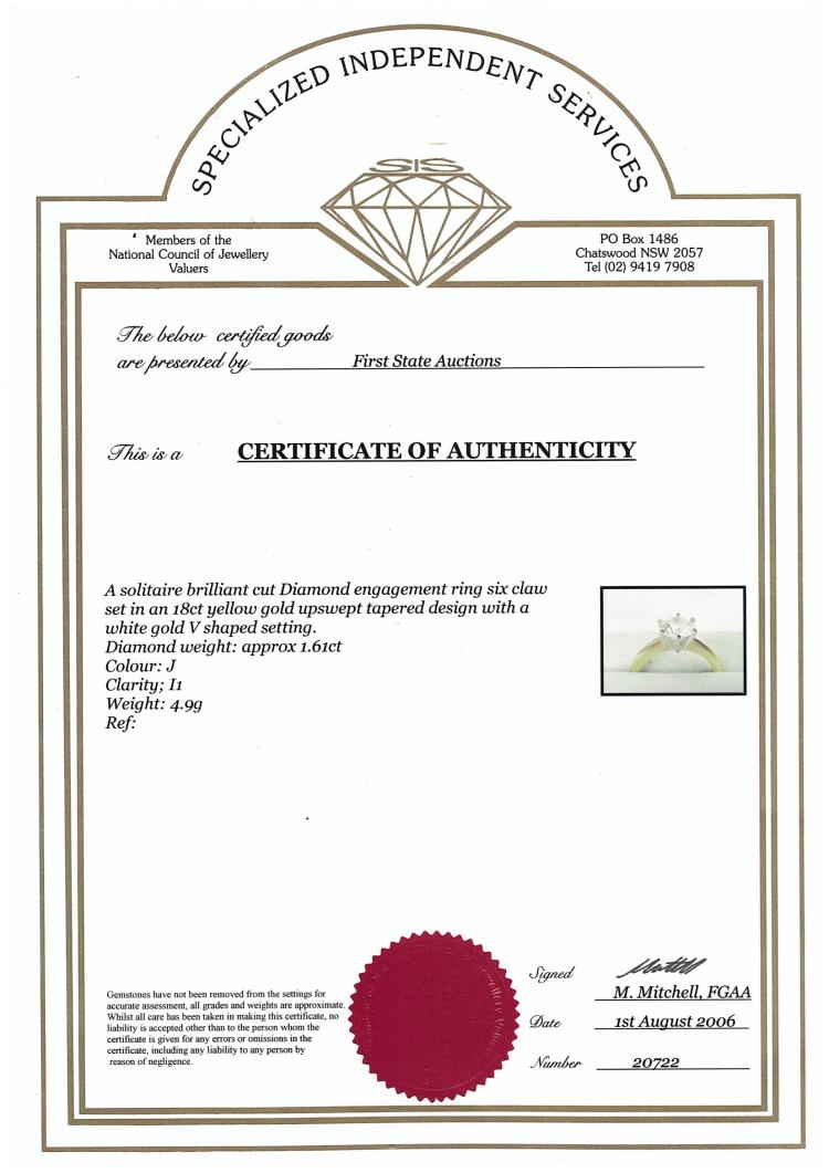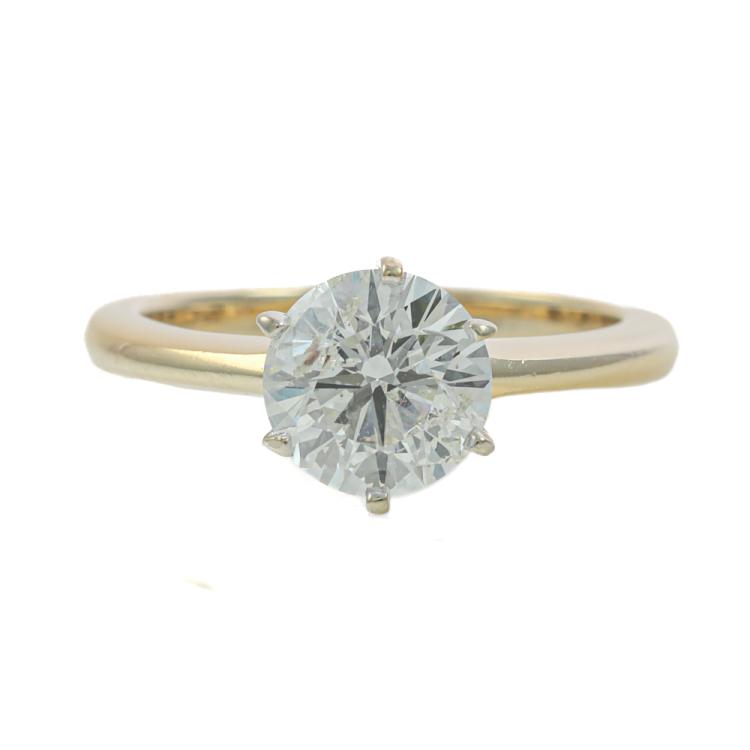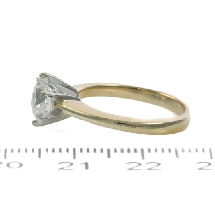 Diamond solitaire ring with a round brilliant cut Natural Diamond of approximately 1.61ct (Estimated grading: J P1). 18ct yellow & white gold. Ring size K1/2. Band width: 2.2mm. Weight: 4.3g. With Certificate of Authenticity #20722. (Pre-owned)