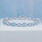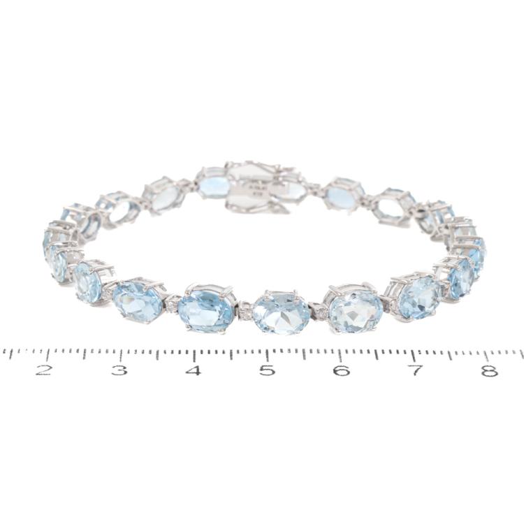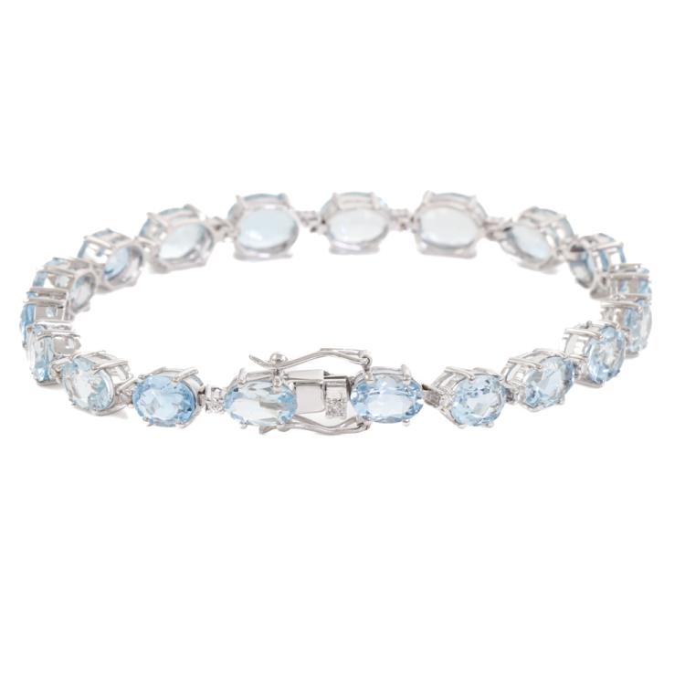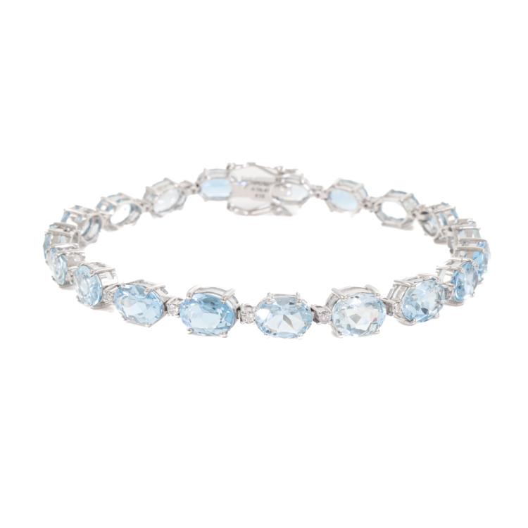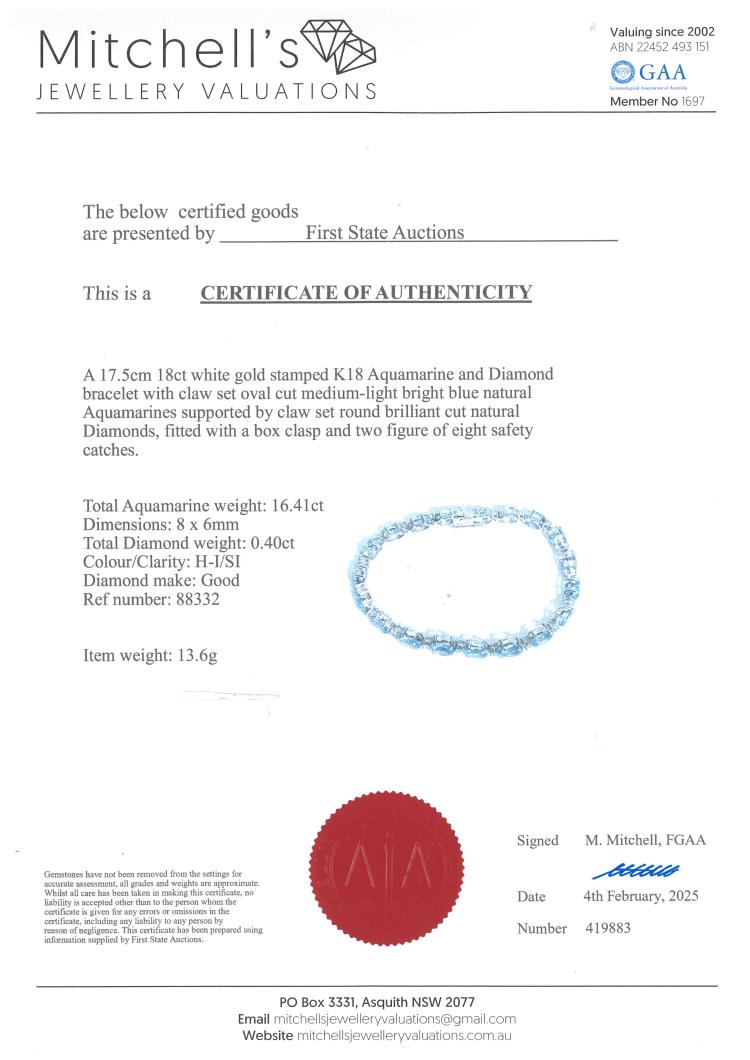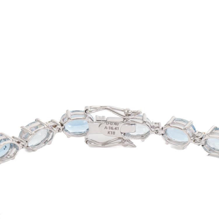 Aquamarine and Diamond bracelet with 19 oval shape Natural Aquamarines totalling 16.41ct and round Natural Diamonds totalling 0.40ct (Estimated grading: H-I SI). 18ct white gold. Length: 17.5cm. Weight: 13.6g. With Certificate #419883. (Pre-owned)