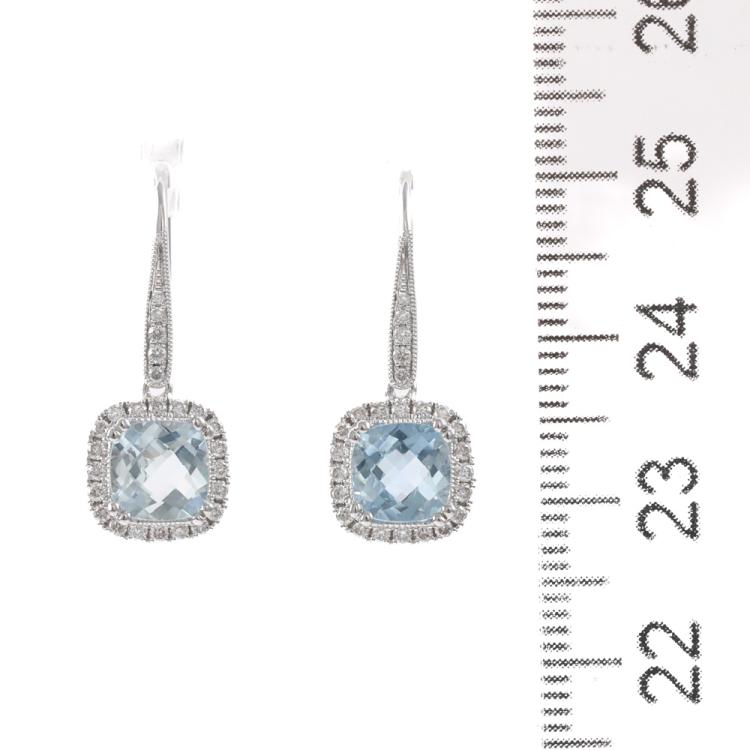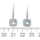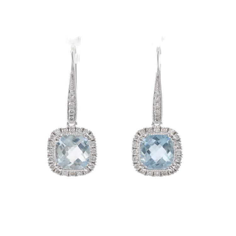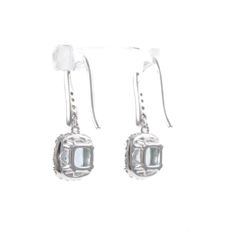 Aquamarine and Diamond shepherds hook drop earrings with cushion cut Natural Aquamarine of 1.70ct and round Natural Diamonds totalling 0.31ct (Estimated grading: H-I SI). 14ct white gold. Weight: 2.9g. (New)