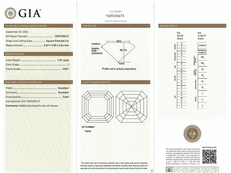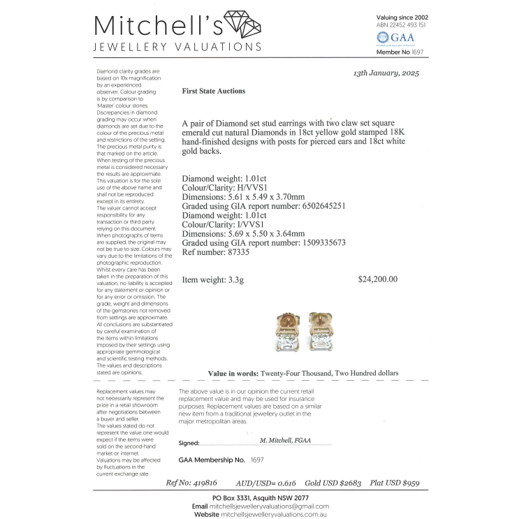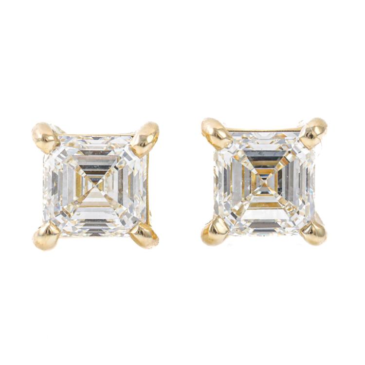 Diamond stud earrings with 2 square emerald cut Natural Diamonds totalling 2.02ct (both with GIA Reports graded as H VVS1 #6502645251 & I VVS1 #1509335673). 18ct yellow gold. Weight: 3.3g. With Valuation Certificate #419816. (New)
