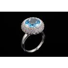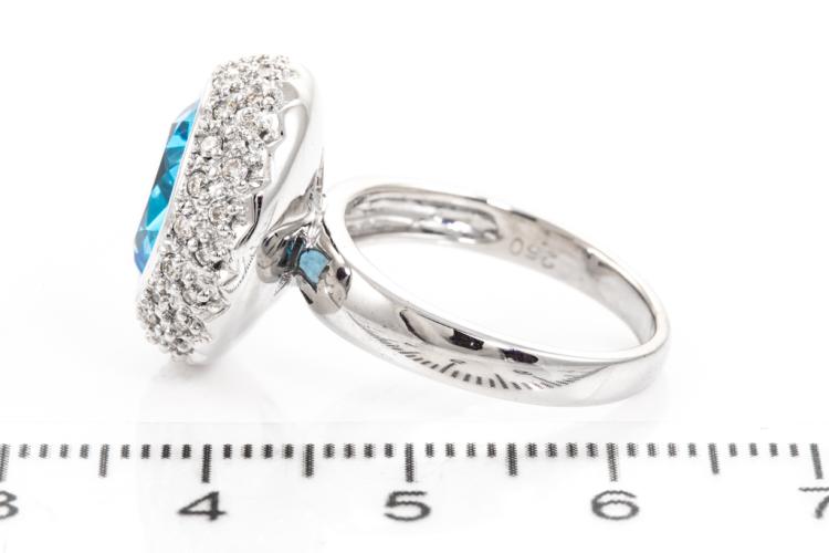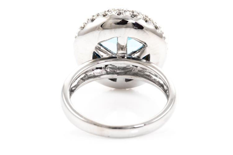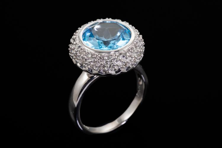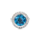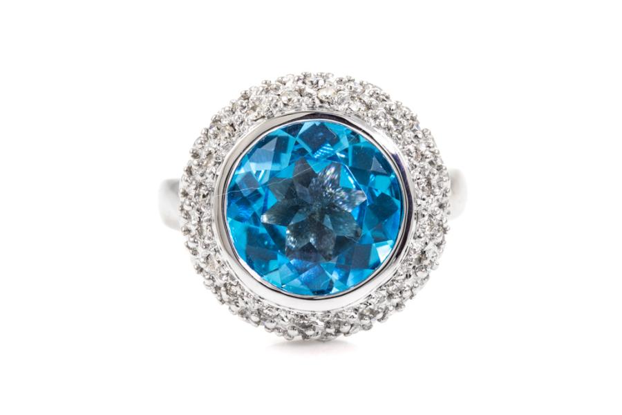 Topaz and Diamond ring with fancy round cut blue Natural Topaz of 2.50ct (11mm x 11mm) and round Natural Diamonds totalling 0.40ct (Estimated grading: I-J SI). 18ct white gold. Ring size L1/2. Band width: 4.2mm - 2.5mm. Weight 9.6g. (Pre-owned)