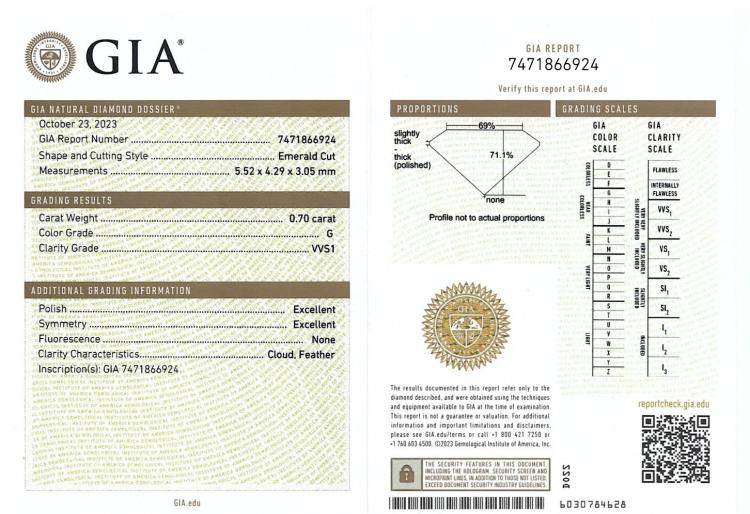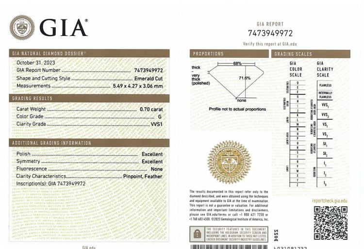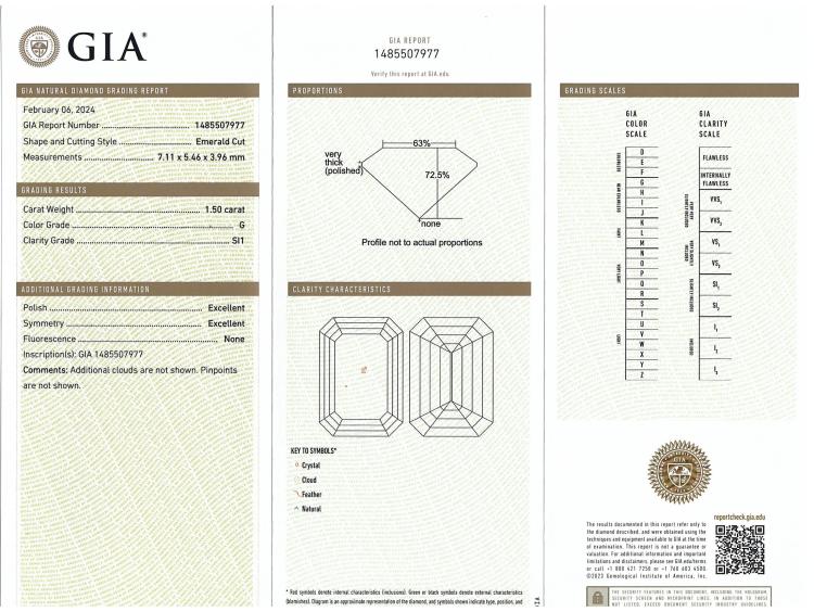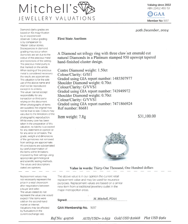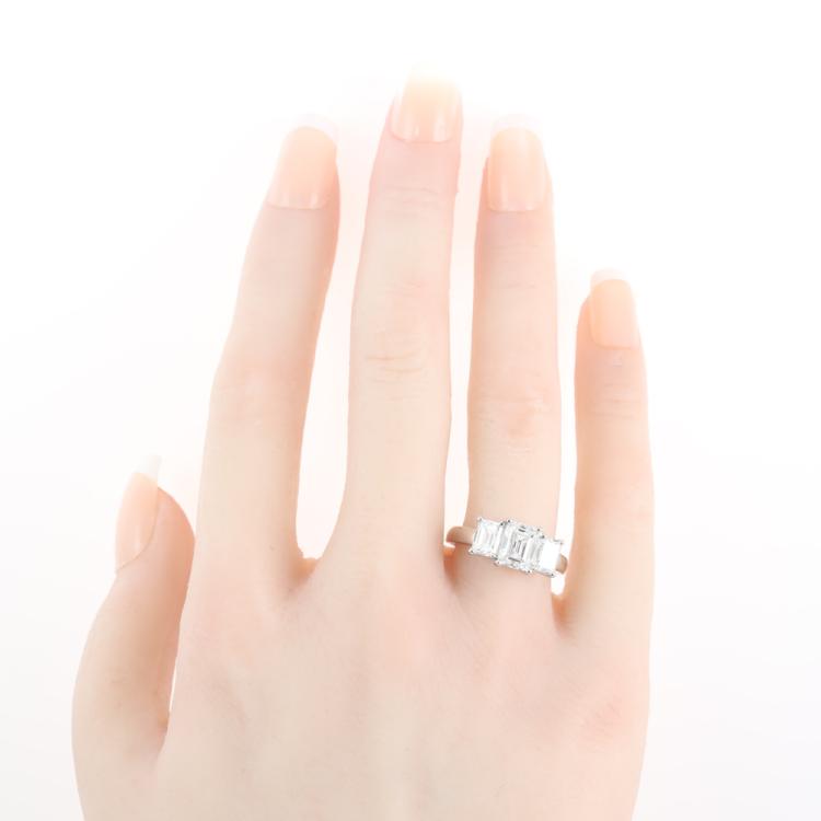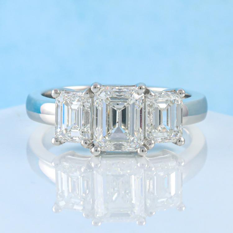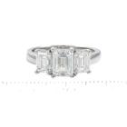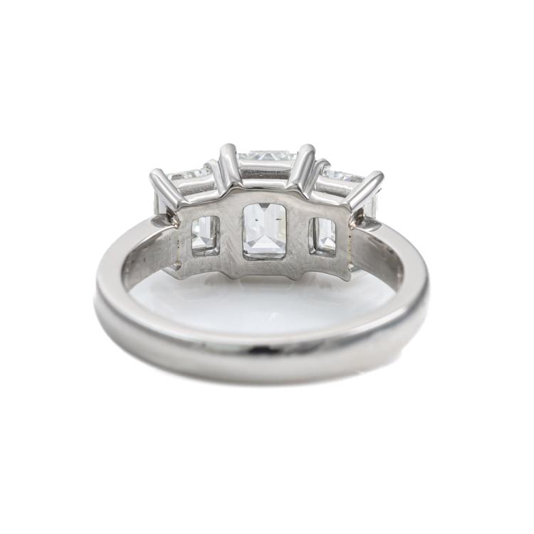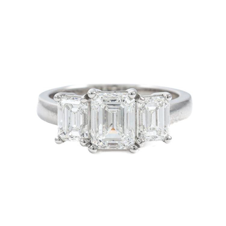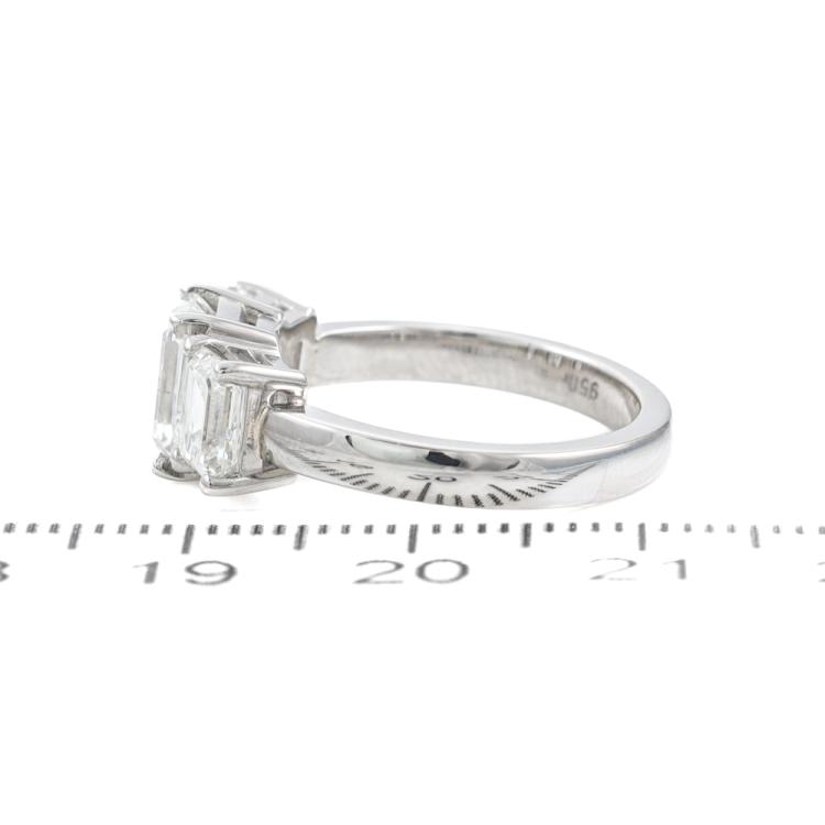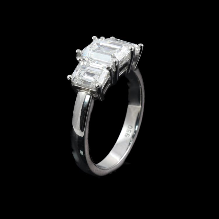 Diamond trilogy ring with centre emerald cut Natural Diamond of 1.50ct (With GIA Report graded as G SI1 #1485507977) and 2 side emerald cut Natural Diamonds totalling 1.40cts (with GIA Summary Reports graded as G VVS1 #7473949972, #7471866924) Platinum 950. Ring size L. Band width: 2.7mm - 2.8mm. Weight: 7.8g. With Valuation Certificate #419716. (New)