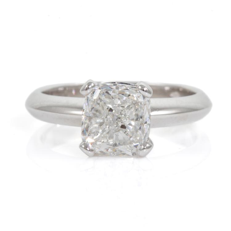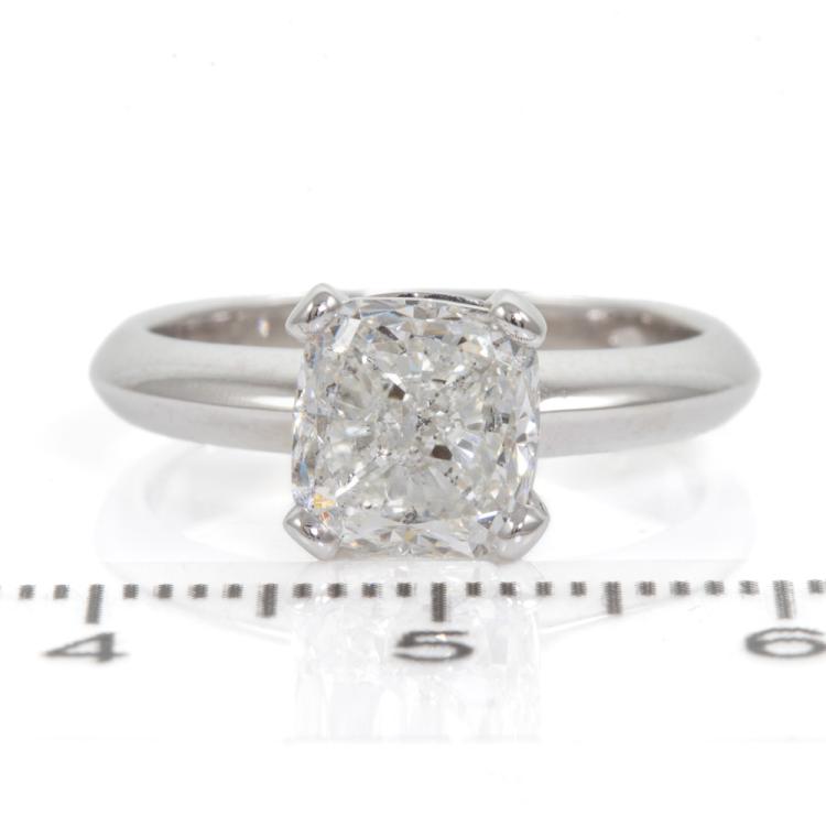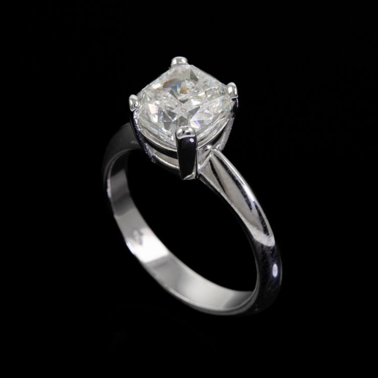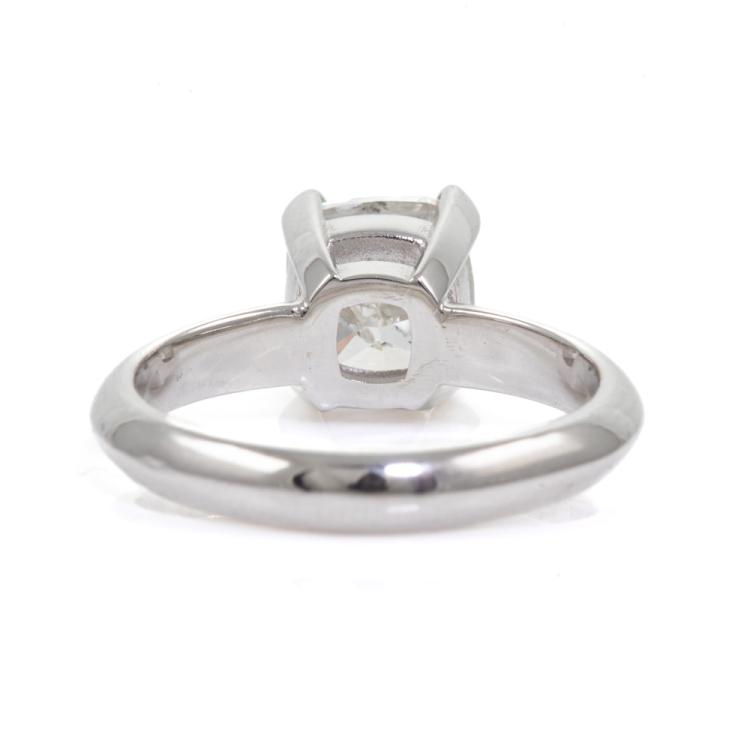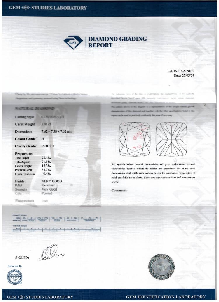 Diamond solitaire ring with a cushion cut Natural Diamond of 3.01ct (with GSL Report graded as H P1 #AA69005). Platinum. Ring size M. Band width 3.1mm. Weight: 7.5g. (New)