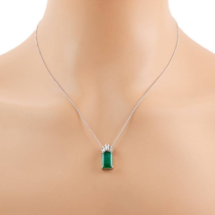 Emerald and Diamond pendant with emerald cut Natural Zambian Emerald of 3.21ct (with GSL Description #AA67990/4) and baguette cut Natural Diamonds totalling 0.28cts. 18ct white gold with adjustable 18ct white gold 45cm chain. Weight: 4.8g (Pre-owned)
