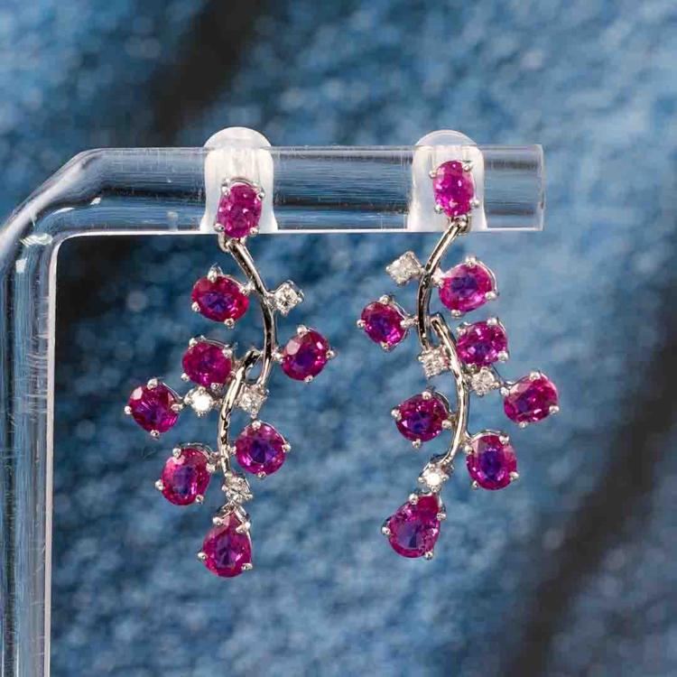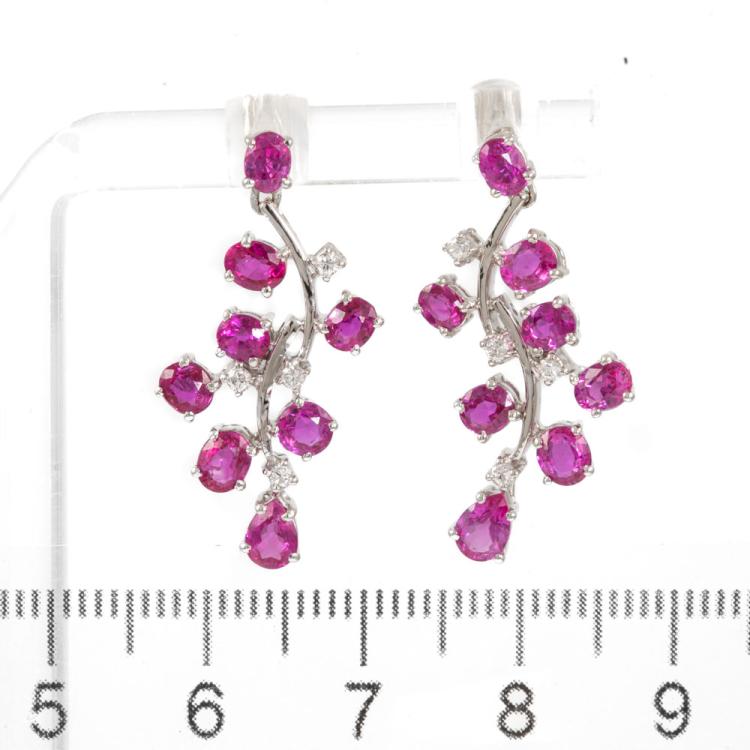 Sapphire and Diamond earrings with oval & pear shape Pink Natural Sapphires totalling 3.64cts and round Natural Diamonds totalling 0.12cts. 18ct white gold with 18ct white gold & silicon backs. Weight: 5.3g. (Pre-owned)