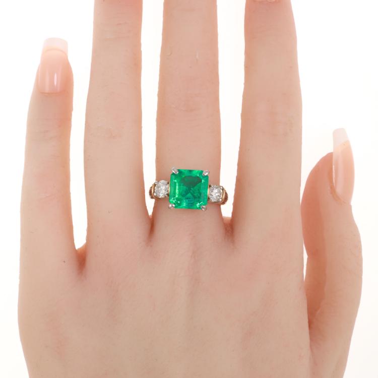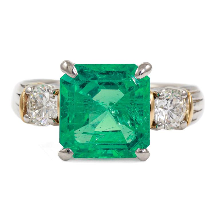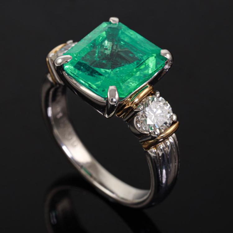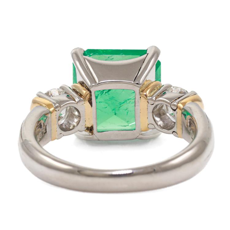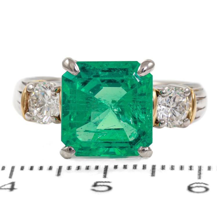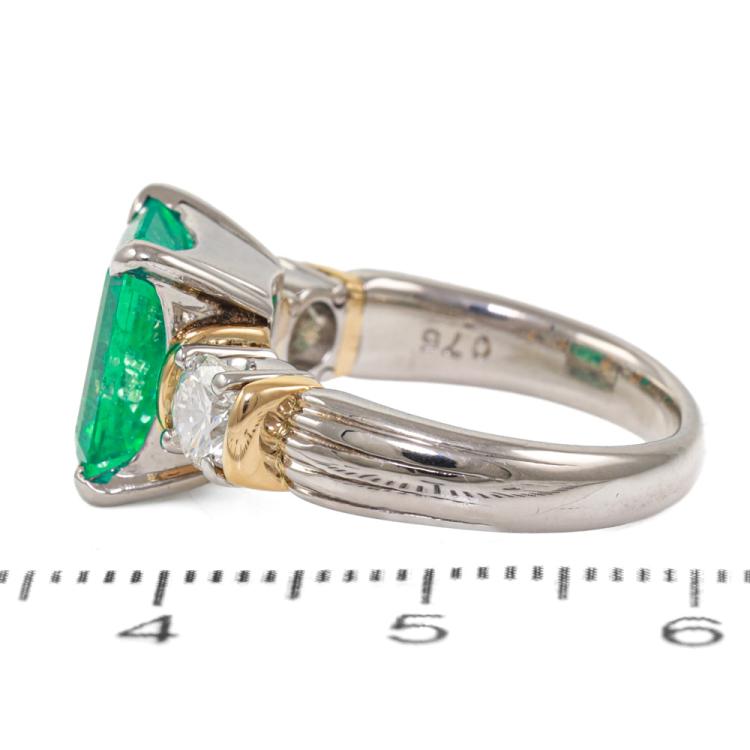 Emerald and Diamond ring with square emerald cut Natural Emerald of 4.06ct and 2 round Natural Diamonds totalling 0.75ct (Estimated Grading: G SI). Platinum-900 and 18ct yellow gold. Ring size: L1/4. Band width: 2.8mm - 4.5mm. Weight: 9.9g. With Certificate #419118 (Pre-owned)
