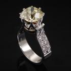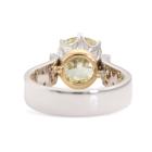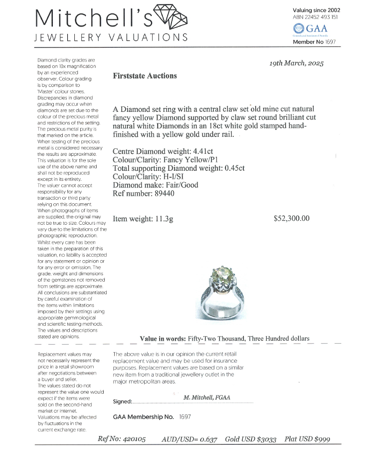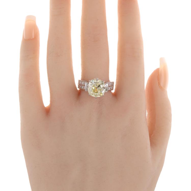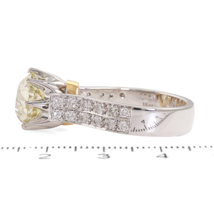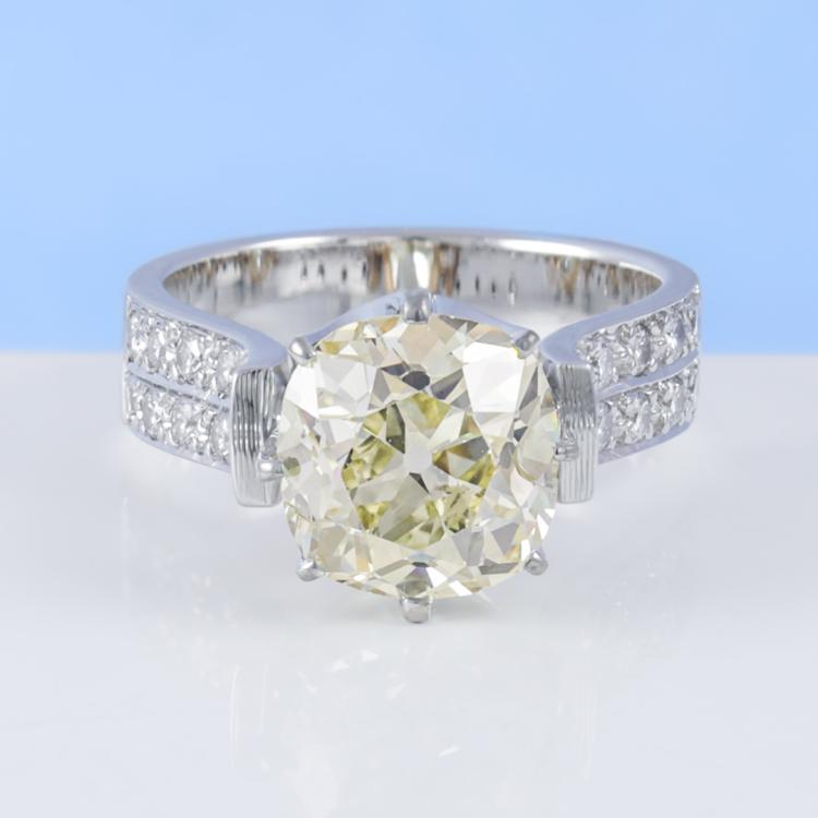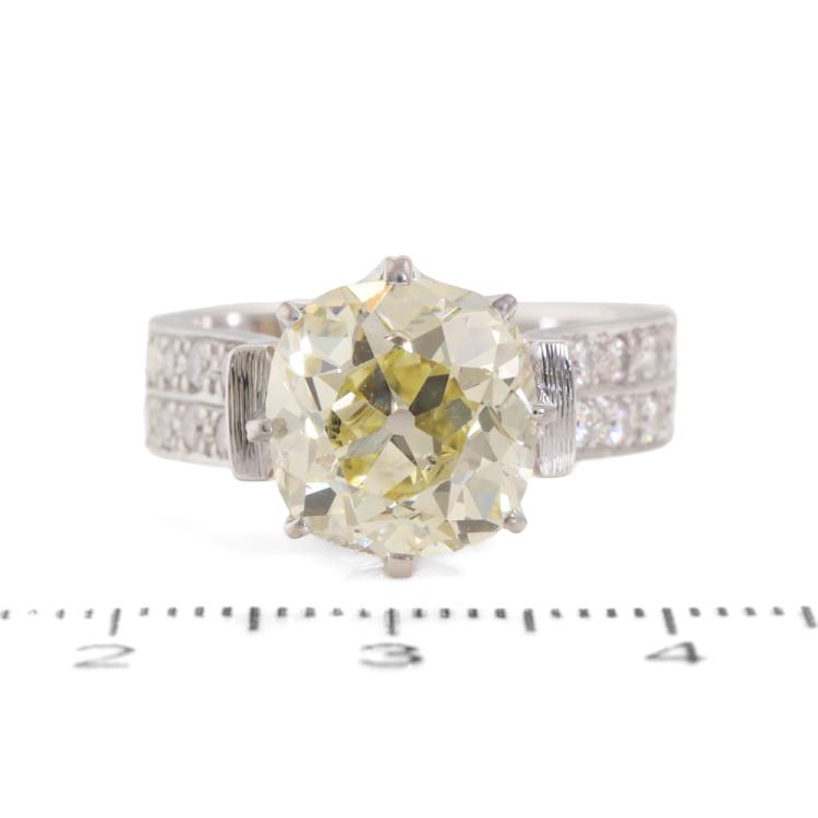 Diamond ring with old mine cut Natural Diamond of approximately 4.41ct (Estimated grading: Fancy Yellow P1) and round Natural Diamonds totalling approximately 0.45ct (Estimated grading: H-I SI). 18ct white and yellow gold. Ring size: Q. Band width: 5.5mm. Weight: 11.3g. With Valuation Certificate #420105. (Pre-owned)
