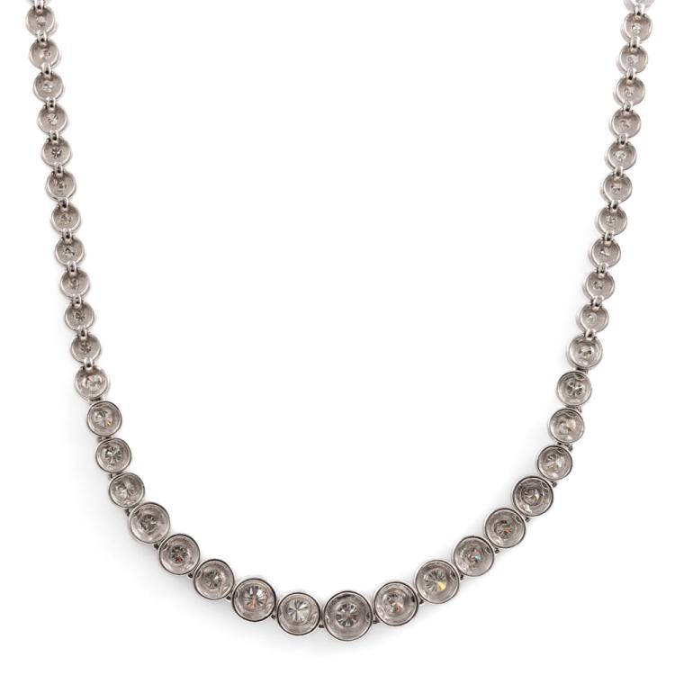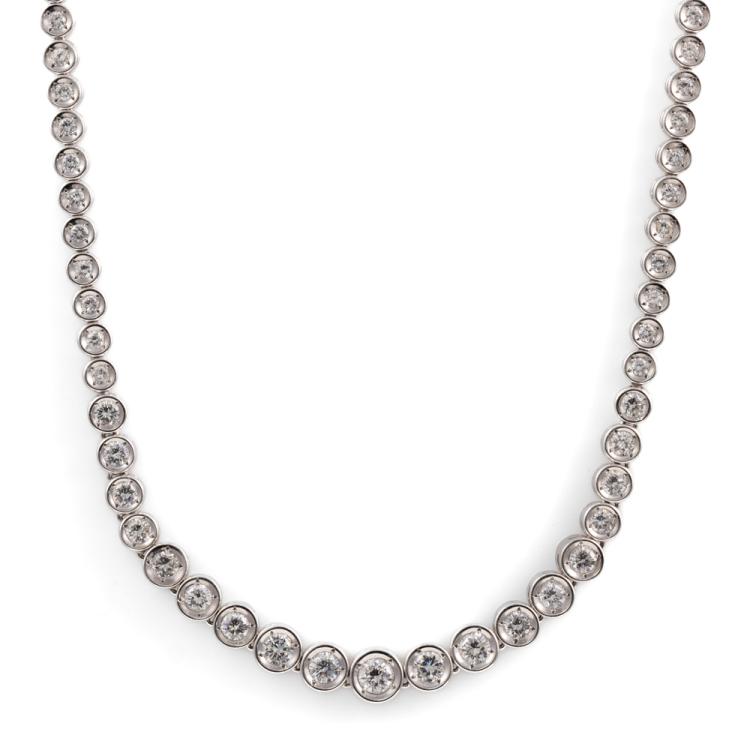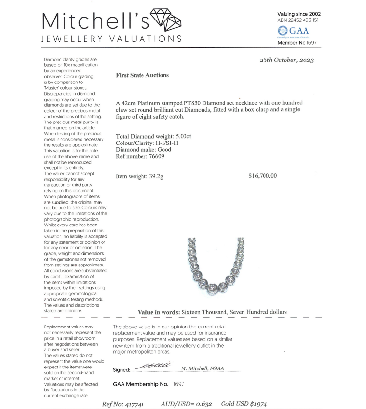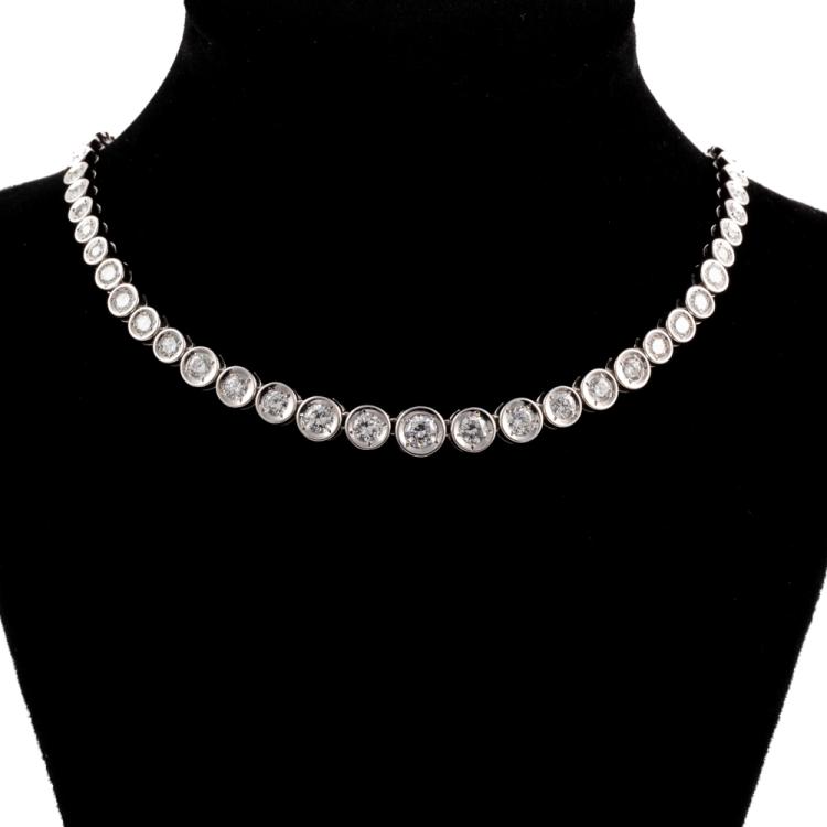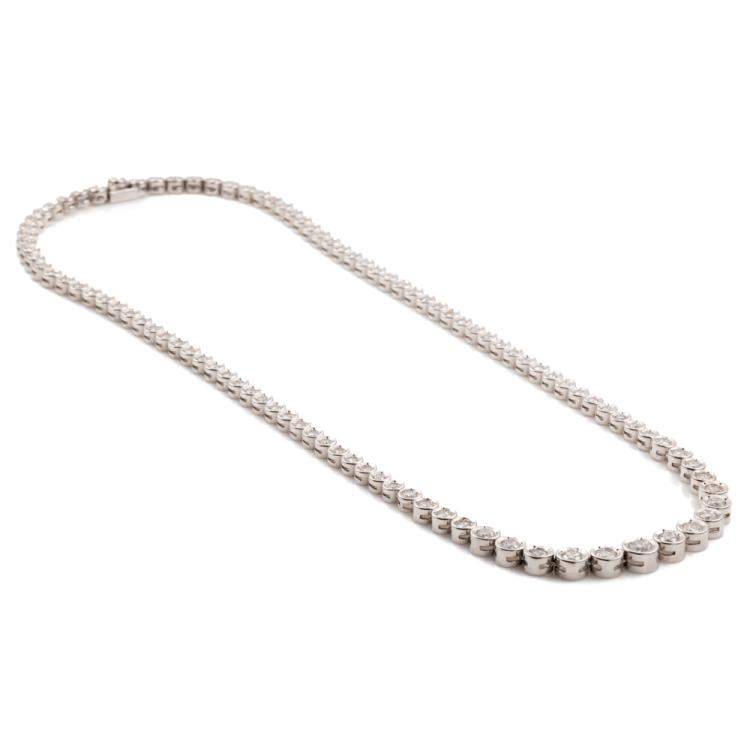 Diamond Tennis necklace with round Natural Diamonds totalling 5.00cts (Estimated grading: H-I SI-P1). Platinum-850. Length: 42cm. Weight: 39.2g. With Certificate #417741. (Pre-owned)