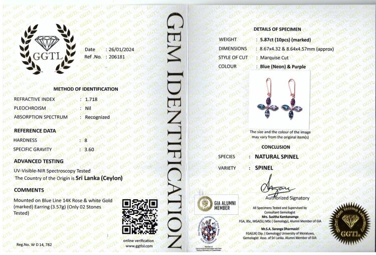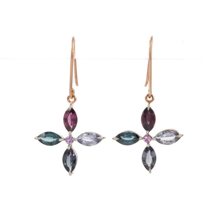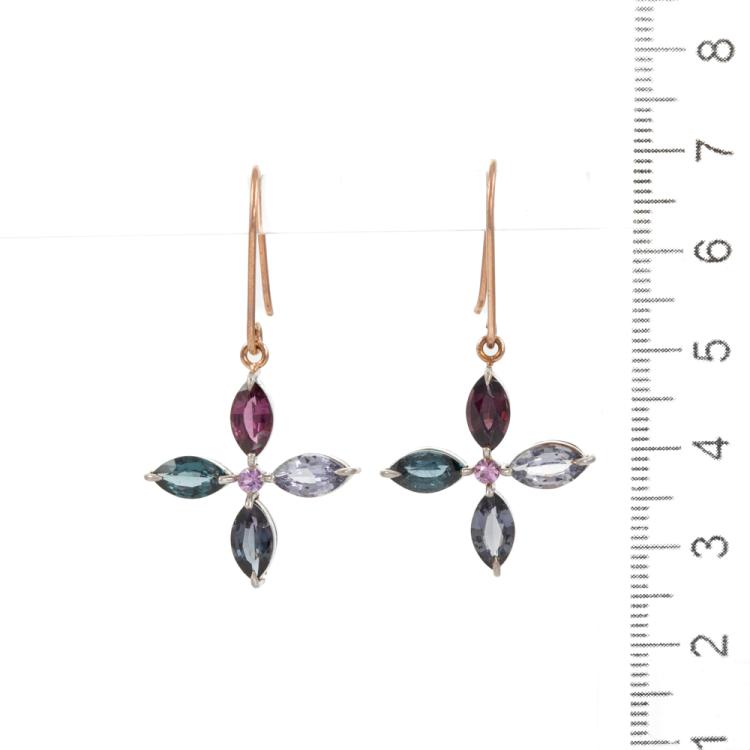 Spinel shepherds hook drop earrings with multi-colour round & pear shape natural Ceylon Spinel totalling 5.87cts (only 2 Spinel tested). 14ct rose and white gold. Weight: 3.5g. With GGTL Report #206181. (As New)