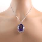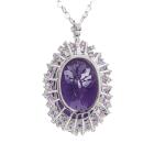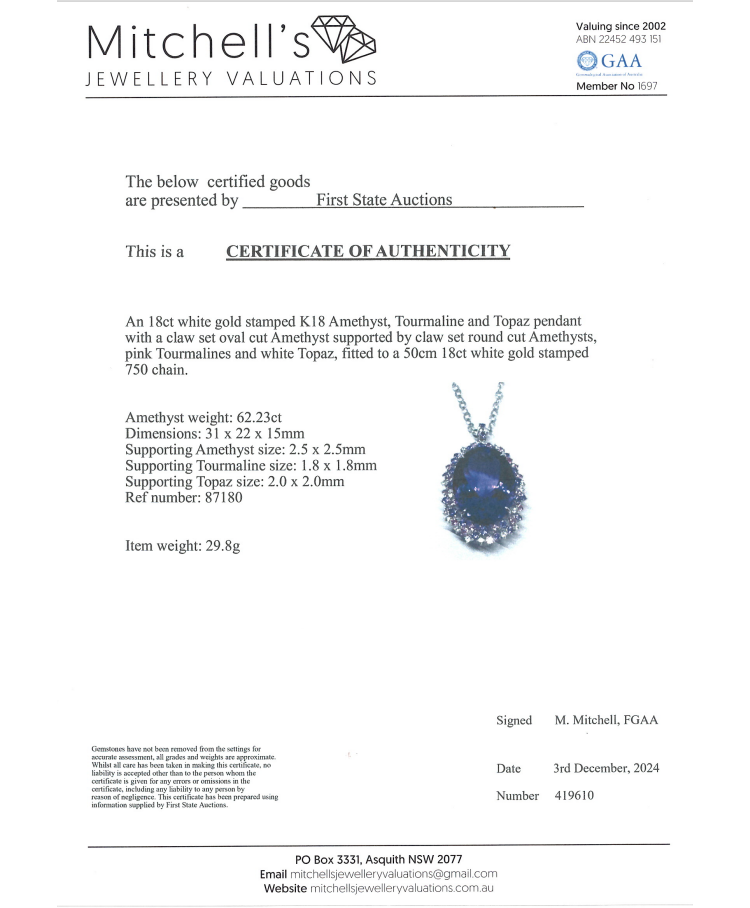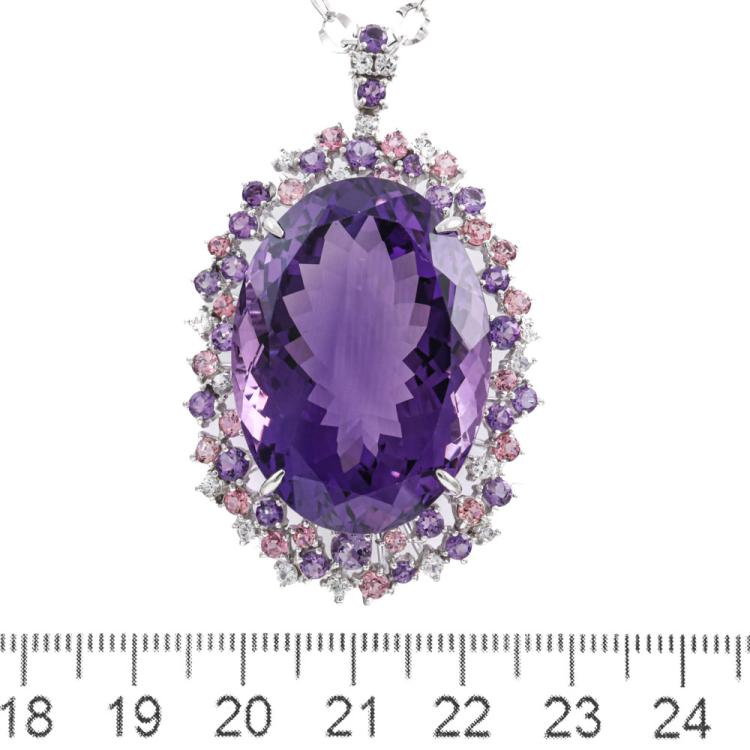 Amethyst and mixed gemstone pendant with oval shape Natural Amethyst of 62.23ct, round Natural Amethysts totalling approximately 1.25ct (approx. size 2.5 x 2.5mm), round Natural pink Tourmalines totalling approximately 0.73ct (approx. size 1.8 x 1.8mm) and round colourless Natural Topaz totalling approximately (approx. size 2.0 x 2.0mm) 0.50ct. 18ct white gold with 18ct white gold 50cm chain. Weight: 29.8g. With Certificate #419610. (Pre-owned)