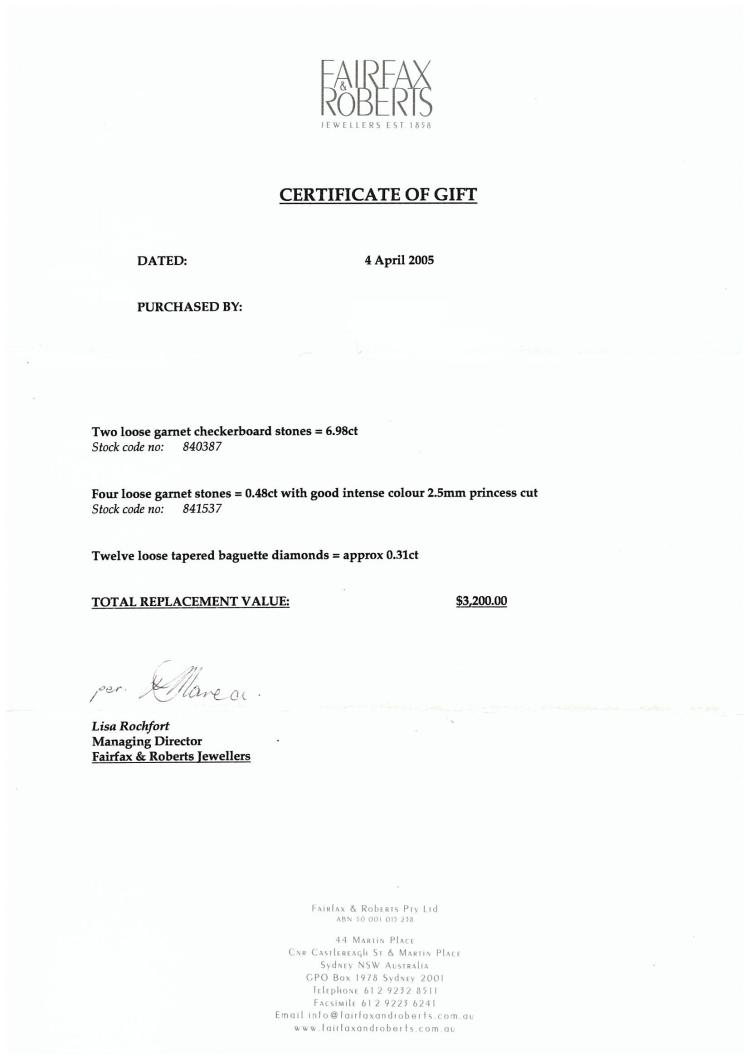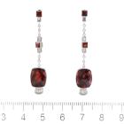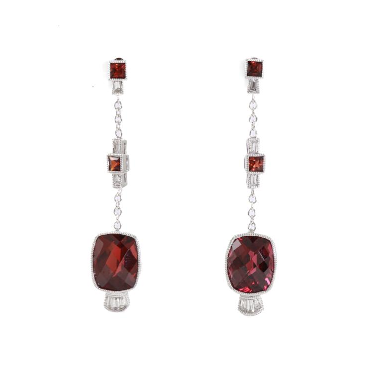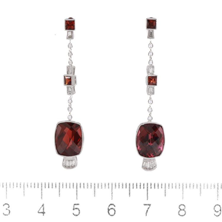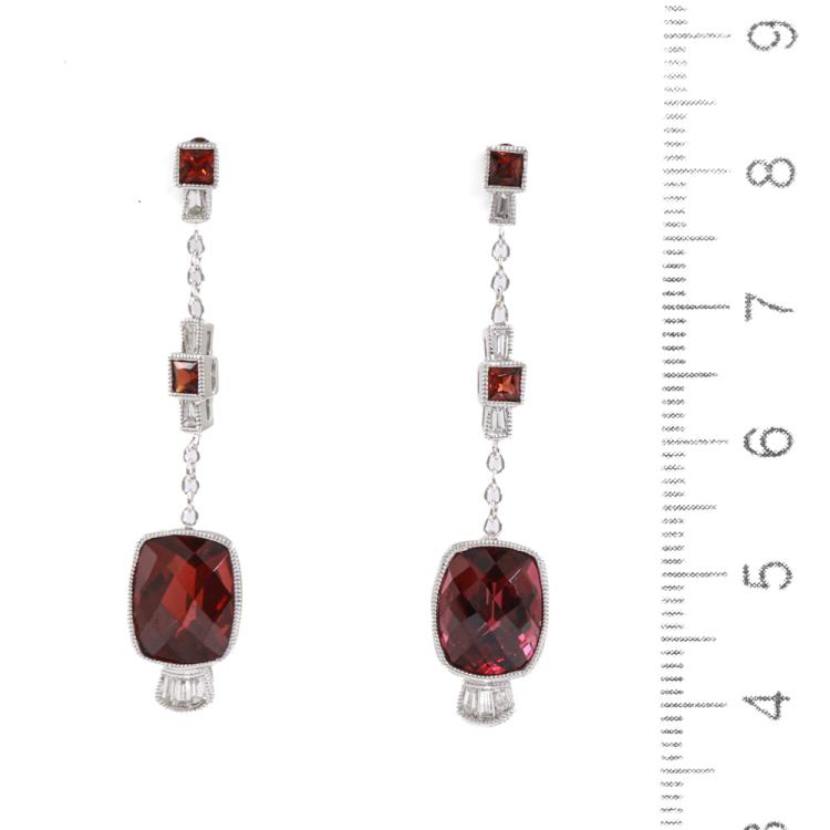 Garnet and Diamond drop earrings with cushion checkerboard & princess cut red & orange Natural Garnets totalling approximately 7.00ct and baguette cut Diamonds totalling approximately 0.31ct (Estimated grading: H-I SI). 18ct white gold. Drop length: 4.2cm. Weight: 6.4g. (Pre-owned)
