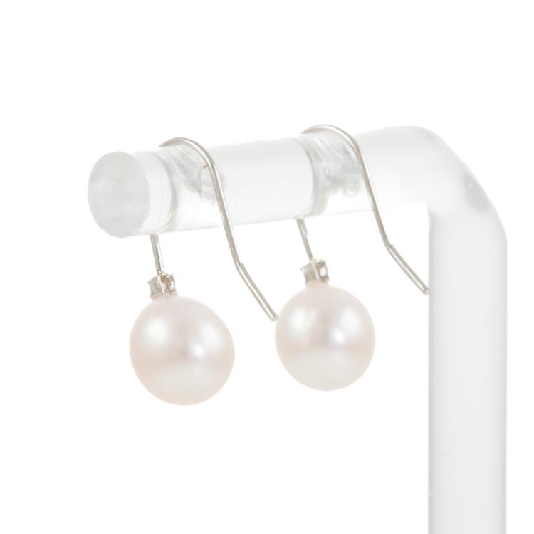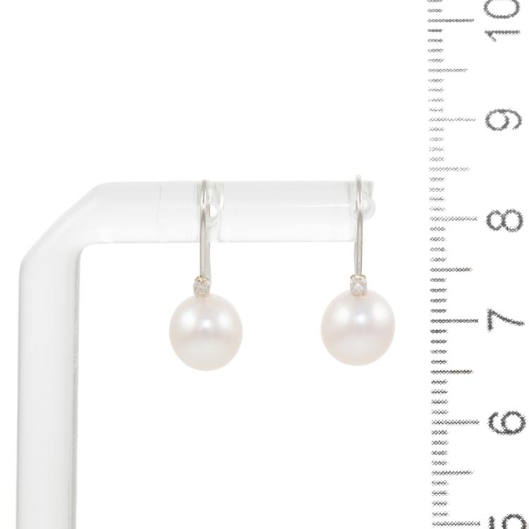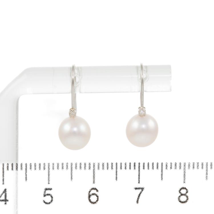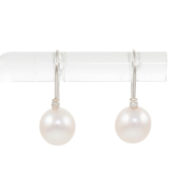 Akoya Pearl and Diamond hook earrings with Akoya Pearl of 7.3mm and round Natural Diamonds totalling 0.02cts. 18ct white gold. Weight: 1.5g. (Pre-owned)