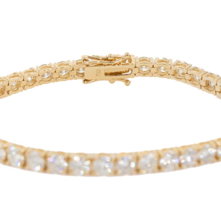 Diamond tennis bracelet with 45 round Natural Diamonds Totalling 9.12ct (Estimated grading: J-K VS). 18ct yellow gold. Length: 18cm. Weight: 13.8g. With Valuation Certificate #418939. (New)