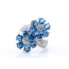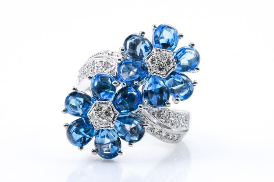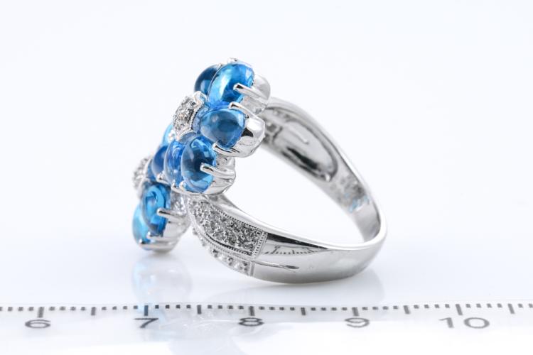 Topaz and Diamond flower design ring with cabochon cut Blue Natural Topaz totalling 9.39cts and round Natural Diamonds totalling 0.40cts (Estimated grading: H SI). 18ct white gold. Ring size M - ring resizing is not recommended. Weight: 12.2g. (Pre-owned)