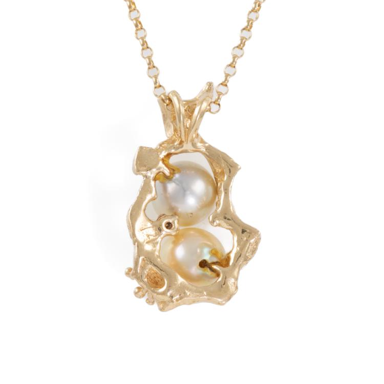 Pearl and Diamond pendant with 2 Akoya pearls of 7.6mm and round Natural Diamond of approximately 0.02ct. 14ct yellow gold with 14ct yellow gold 50cm chain. Weight: 7.5g. With copy of GSL Valuation #AA 63603, item 2. (Pre-owned)^