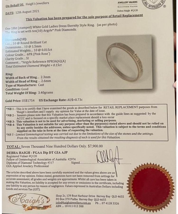 Diamond ring set with a centre round brilliant cut Natural Diamond of 0.23ct (Estimated grading: F-G VS1) and remaining round Natural Diamonds totalling 0.60cts. Matching band with 10 round Natural Diamonds totalling 0.15cts (Graded as 6 Pink Rose SI Argyle ref# RPR3A(6)(A)). 18ct white gold (note resize mark on main ring). Ring size Q. Band width: 4.5mm-5mm & 2.3mm-2.6mm. Total weight: 11.2g. With copies of Haigh's Jewellers dated 12/08/21. (Pre-owned)