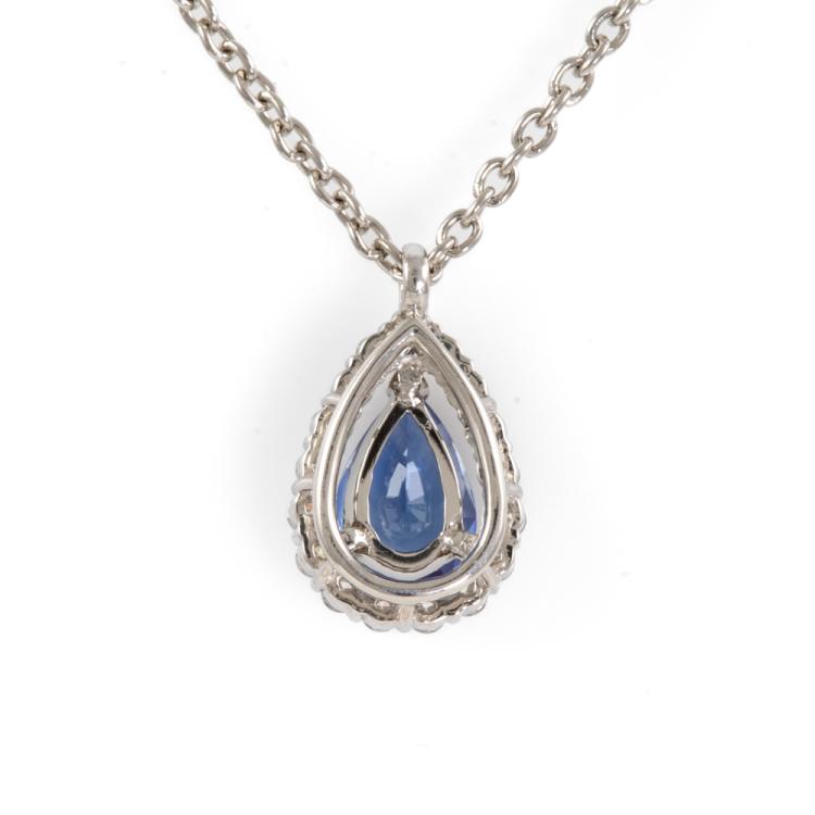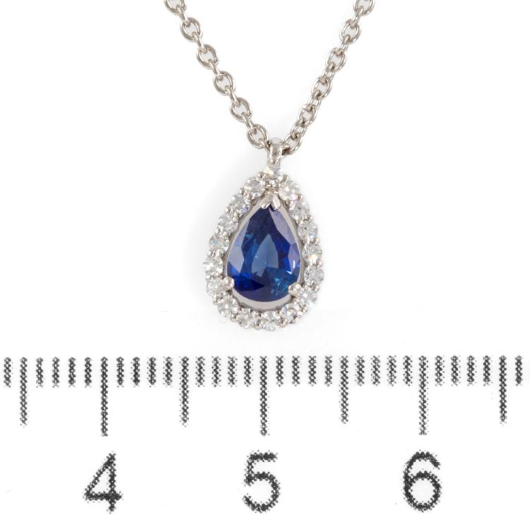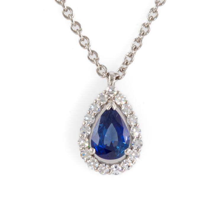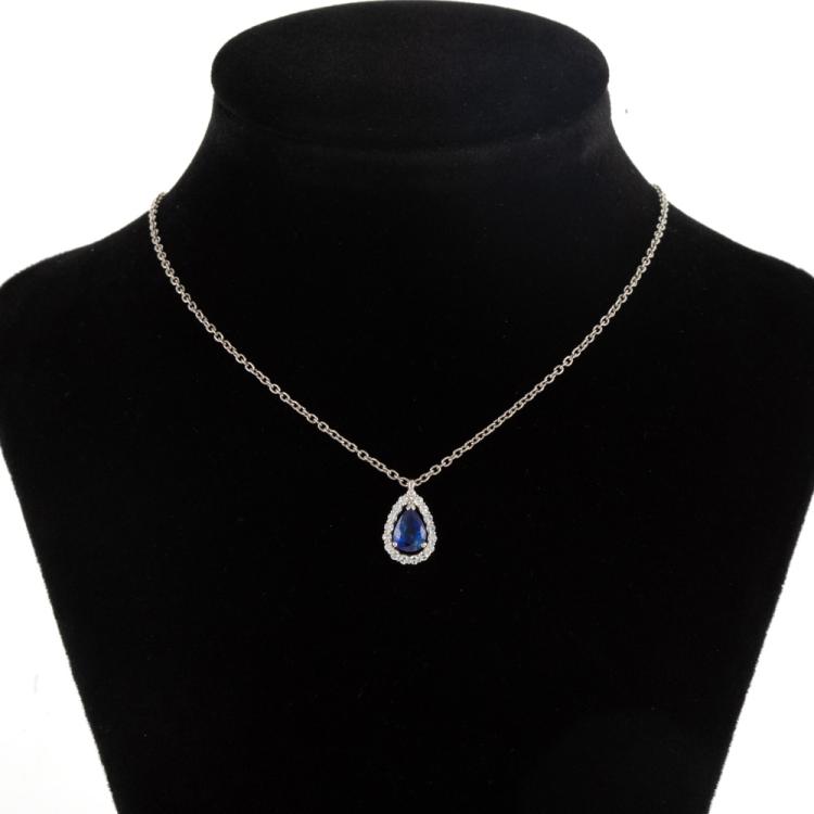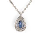 Sapphire and Diamond pendant with pear shape blue Natural Sapphire of 0.53ct and round Natural Diamonds totalling approximately 0.15cts. Platinum 900 with 50.0cm Platinum 900 Adjustable chain. Weigh: 5.3g. (Pre-owned)
